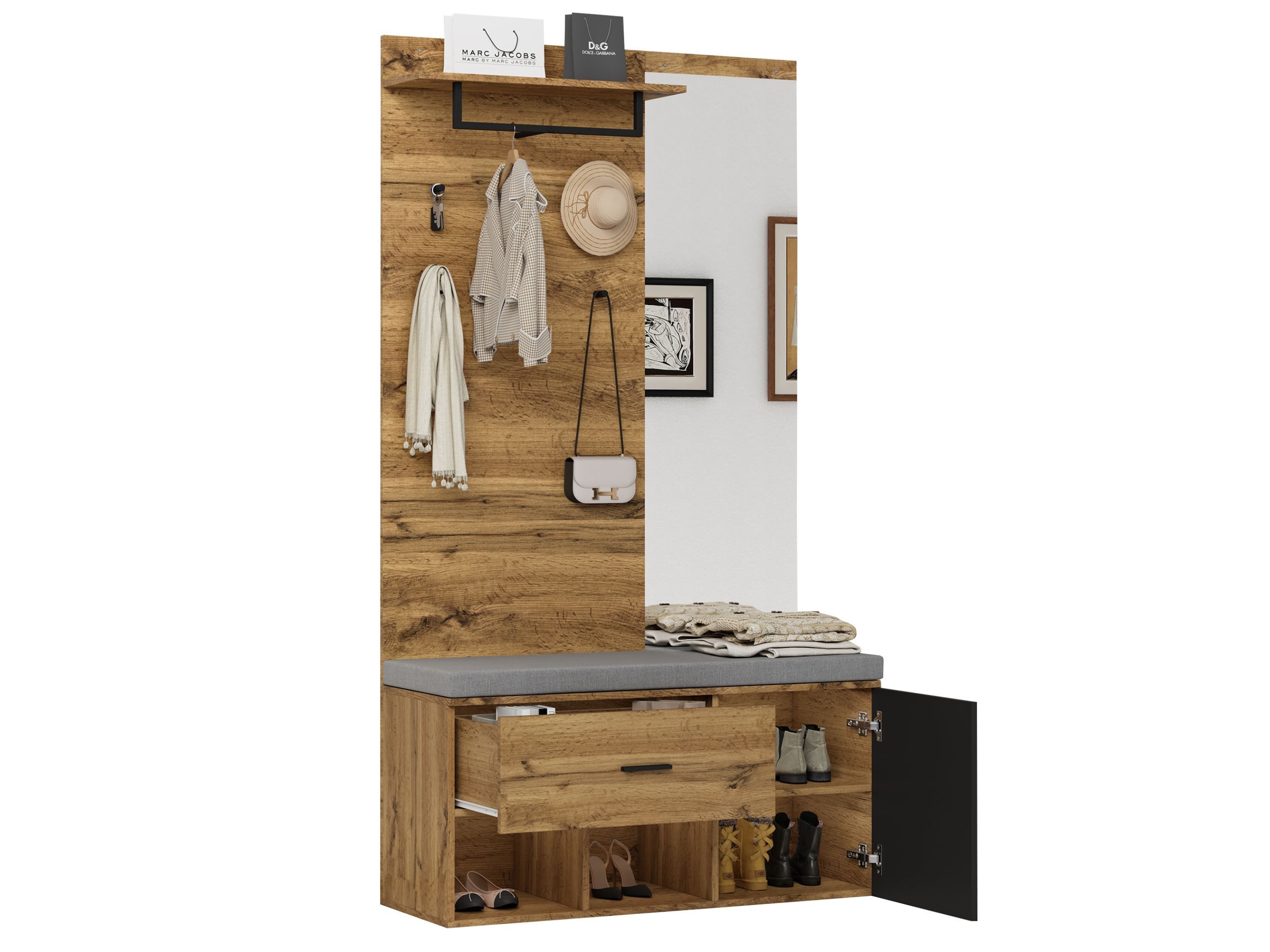 Multifunktionales Meisterstück: Dieser 7-in-1-Garderobe kombiniert Spiegel, Kleiderhaken, Stange, Sitzbank, Schubladen und Regale und nutzt den Flur optimal aus.