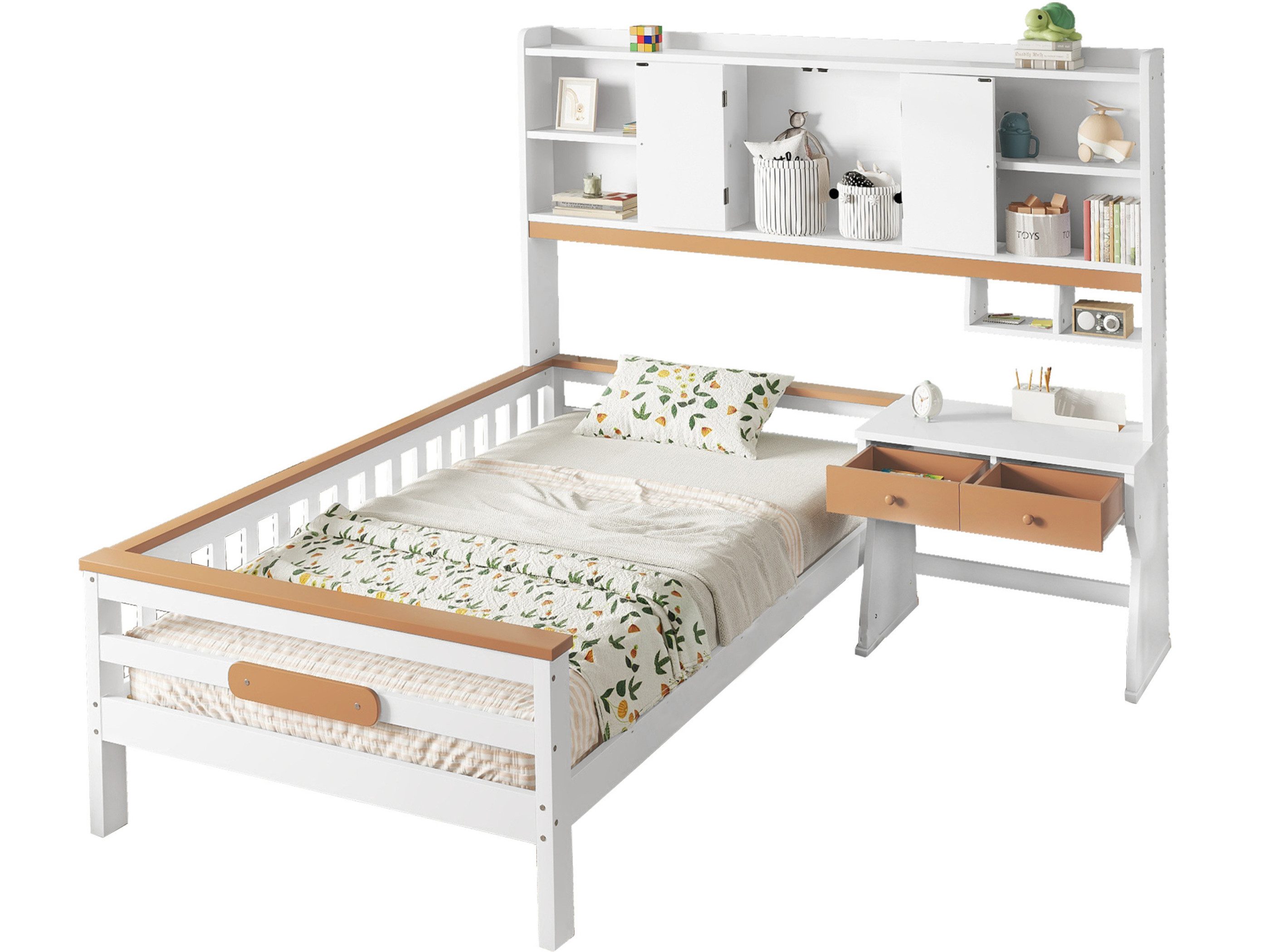 Dieses durchdacht gestaltete Holzbett vereint Schlaf-, Lern- und Stauraummöglichkeiten in einem kompakten Möbelstück. Das L-förmige Design kombiniert ein gemütliches Einzelbett mit einem geräumigen Bücherregal und einem funktionalen Schreibtisch. Das dreiseitige Schutzgeländer sorgt für Sicherheit während der Nacht, während das Regal mit offenen und geschlossenen Fächern jede Menge Stauraum bietet. Der praktische Schreibtisch mit zwei Schubladen eignet sich ideal für Hausaufgaben oder kreative Aktivitäten. Unter dem Bett stehen 24 cm Bodenfreiheit zur Verfügung, die sich hervorragend für flache Aufbewahrungsboxen eignen. Eine platzsparende All-in-One-Lösung – perfekt für Kinder- oder Jugendzimmer.