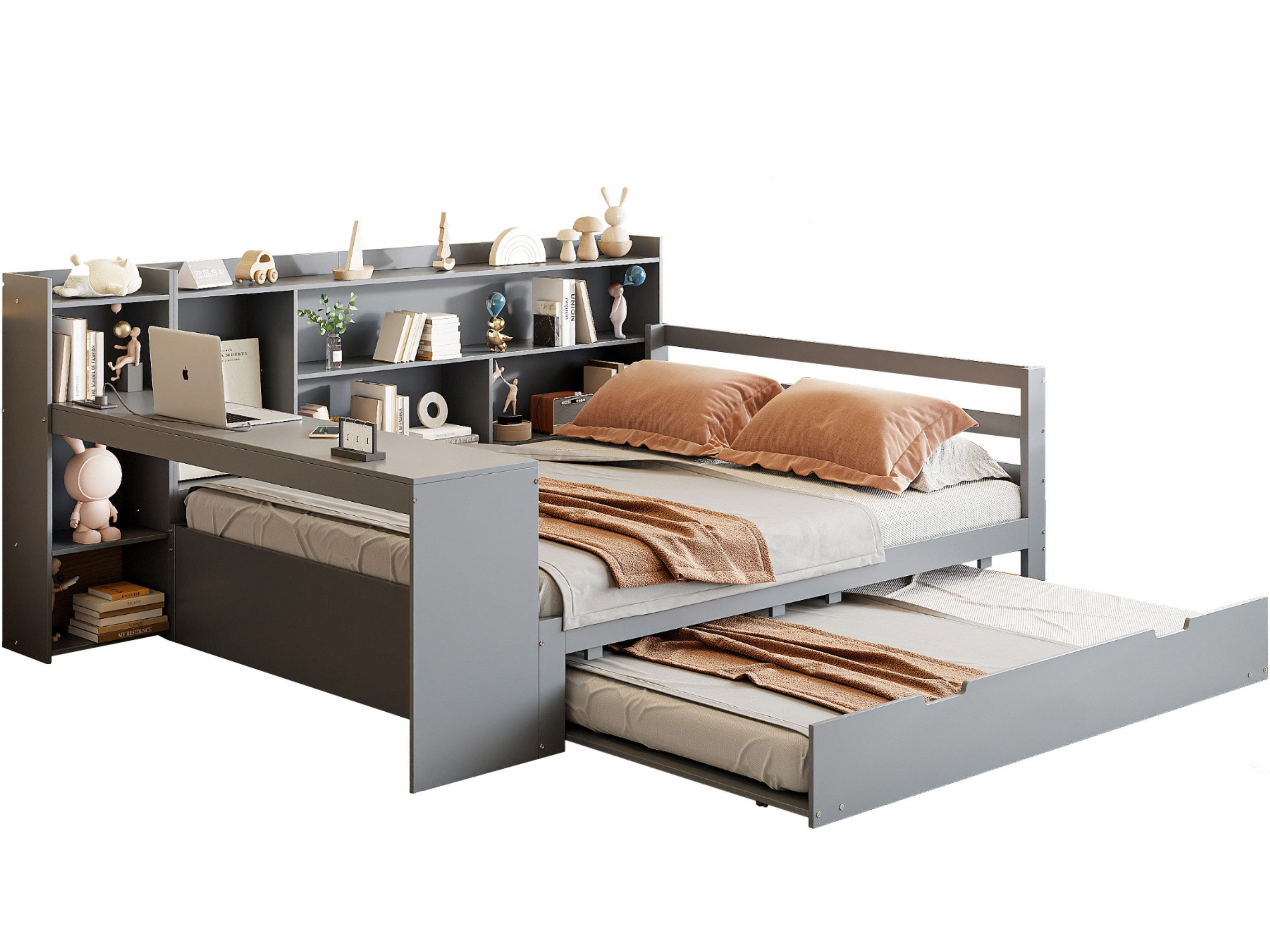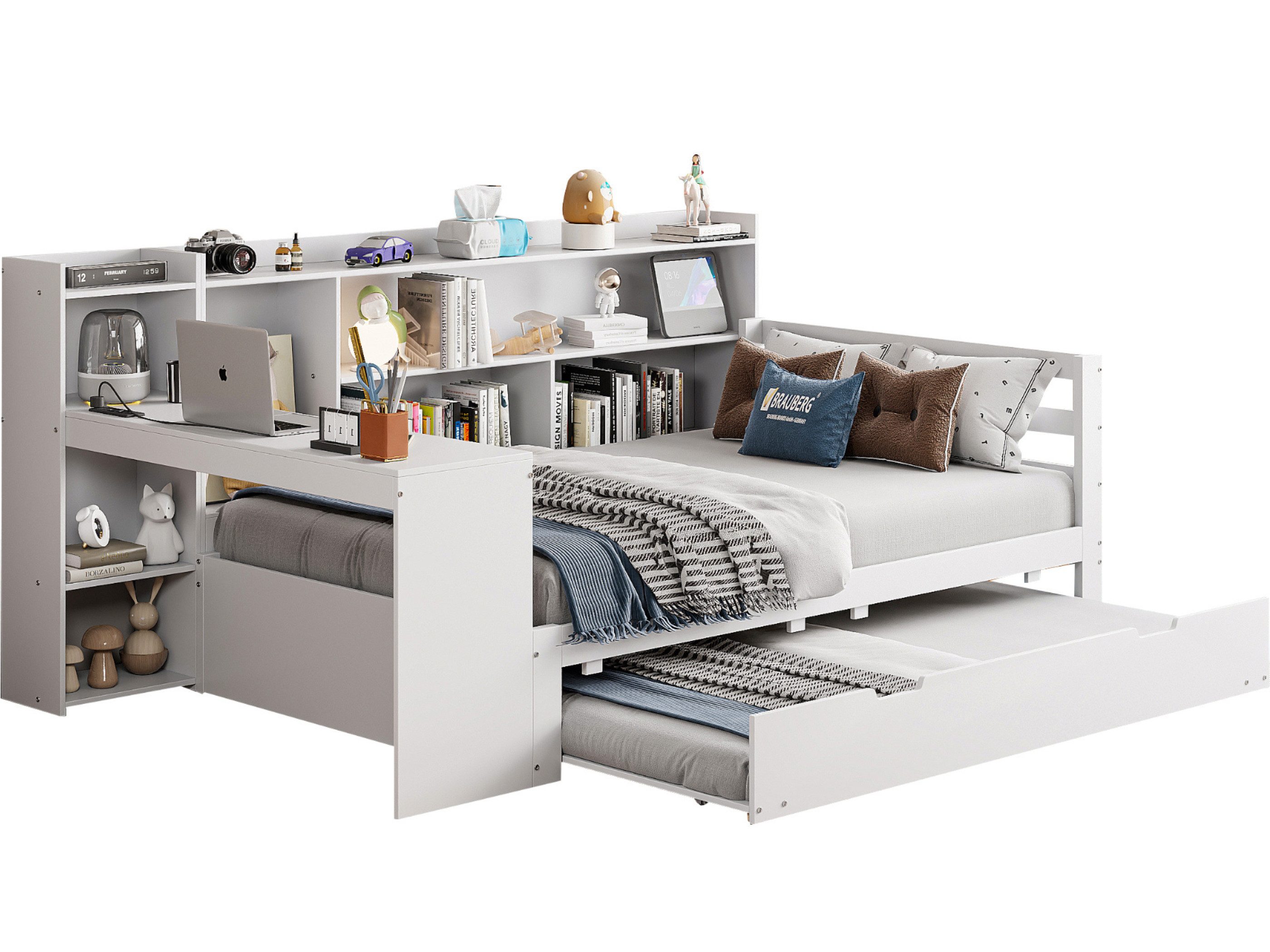 Dieses multifunktionale Holz-Bett ist die perfekte Lösung für moderne Wohnungen, in denen Funktionalität und Platzersparnis gefragt sind. Es vereint mehrere essentielle Möbelstücke in einem einzigen Produkt und maximiert damit den verfügbaren Raum. Der integrierte Arbeitstisch am Kopfende des Bettes bietet nicht nur eine bequeme Arbeitsfläche, sondern ist auch mit praktischen Steckdosen und USB-Ladeanschlüssen ausgestattet, damit Sie Ihre Geräte jederzeit aufladen können, während Sie arbeiten oder entspannen. Zusätzlich dazu bietet das Bett ein großzügiges Bücherregal mit offenen Fächern, das Platz für Ihre Bücher, Dekorationsartikel oder andere persönliche Gegenstände bietet. So haben Sie alles, was Sie brauchen, direkt in Reichweite. Unter dem Bett befinden sich 1 grifflose unvollständige Schublade, die sich durch ihren konkaven Oberrahmen einfach herausziehen lassen, als eine Liegefläche oder um zusätzlichen Stauraum zu bieten – ideal für Bettwäsche, Kleidung oder andere Utensilien, die Sie ordentlich verstauen möchten. Das stabile Bettgestell sorgt nicht nur für eine sichere und komfortable Basis, sondern bietet auch eine langjährige Haltbarkeit. Das Design des Bettes ist so konzipiert, dass es auch in kleinen Räumen gut zur Geltung kommt, ohne den Raum zu überladen. Dieses Bett ist mehr als nur ein Schlafplatz – es ist ein multifunktionales Möbelstück, das Sie bei allen täglichen Aufgaben unterstützt, den Raum maximiert und für Ordnung sorgt.