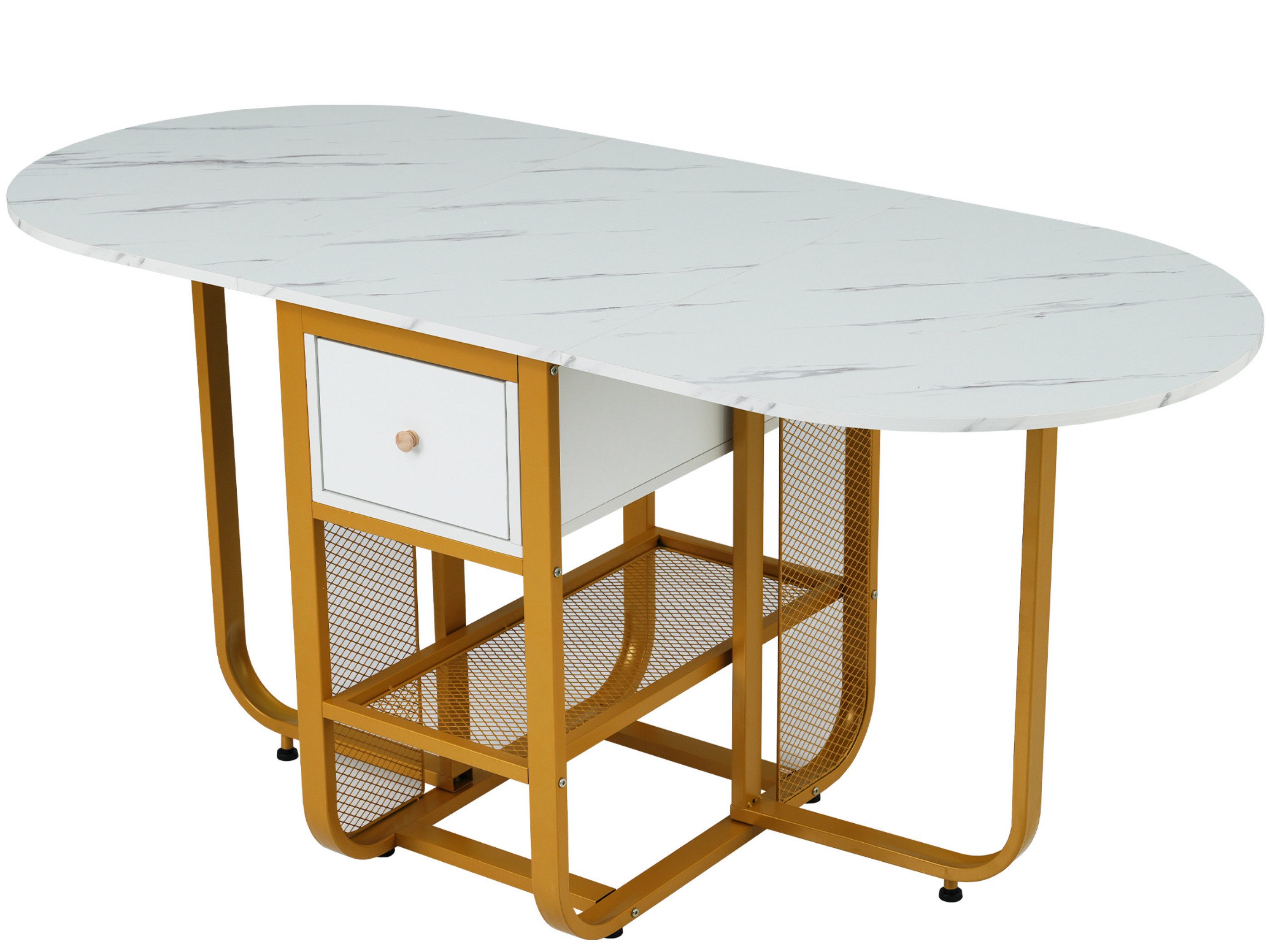Der SeedWave Esstisch vereint Eleganz und Funktionalität mit einer Marmorstruktur-Oberfläche und modernem Weiß-Gold oder Weiß-Schwarz Design. Er bietet Platz für 6 Personen und lässt sich kompakt zusammenklappen. Eine zentrale Schublade und ein Gitterregal sorgen für praktischen Stauraum. Hochwertig und leicht zu montieren, passt er perfekt in jedes Esszimmer.