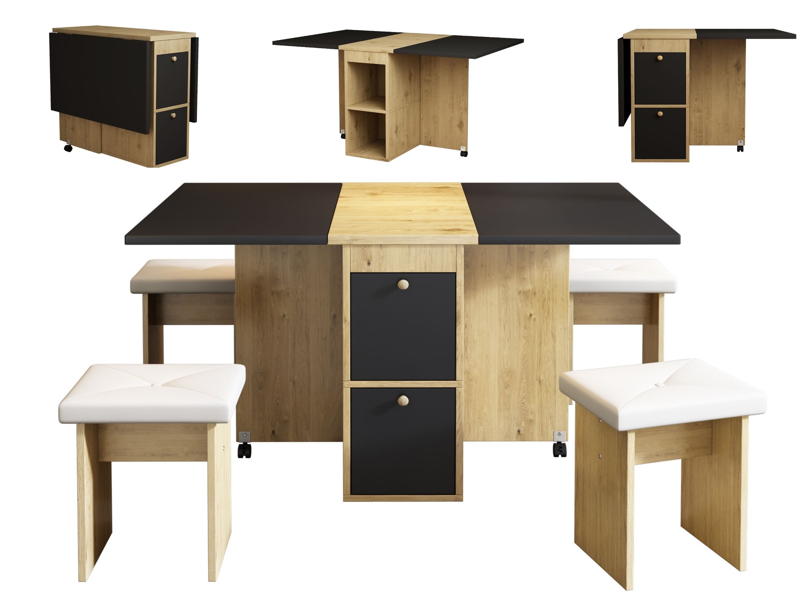 Kompaktes Design: Klappt von 33x80x75 cm auf 120x80x75 cm, bietet Platz für vier Gäste und die Hocker lassen sich platzsparend verstauen.