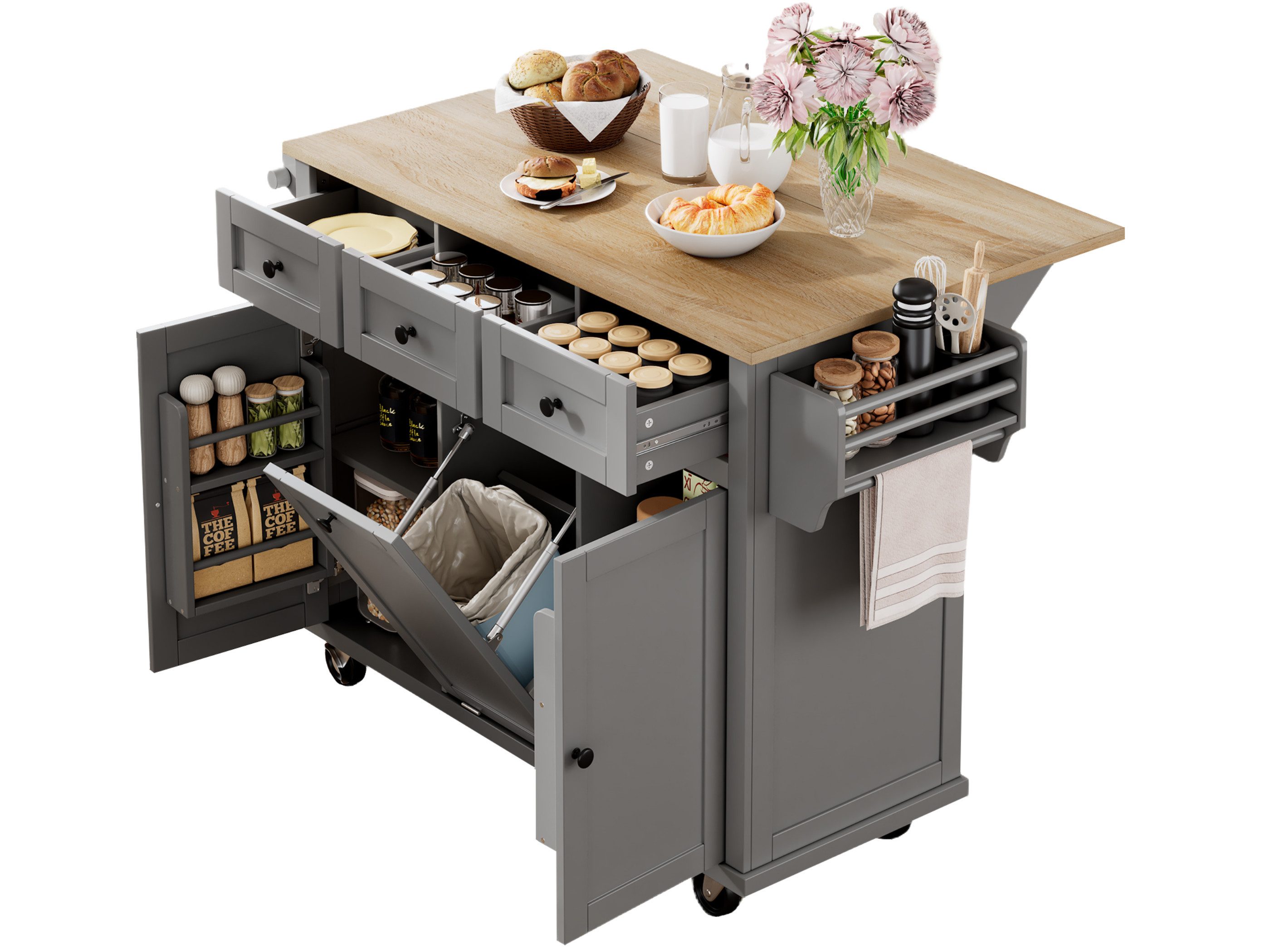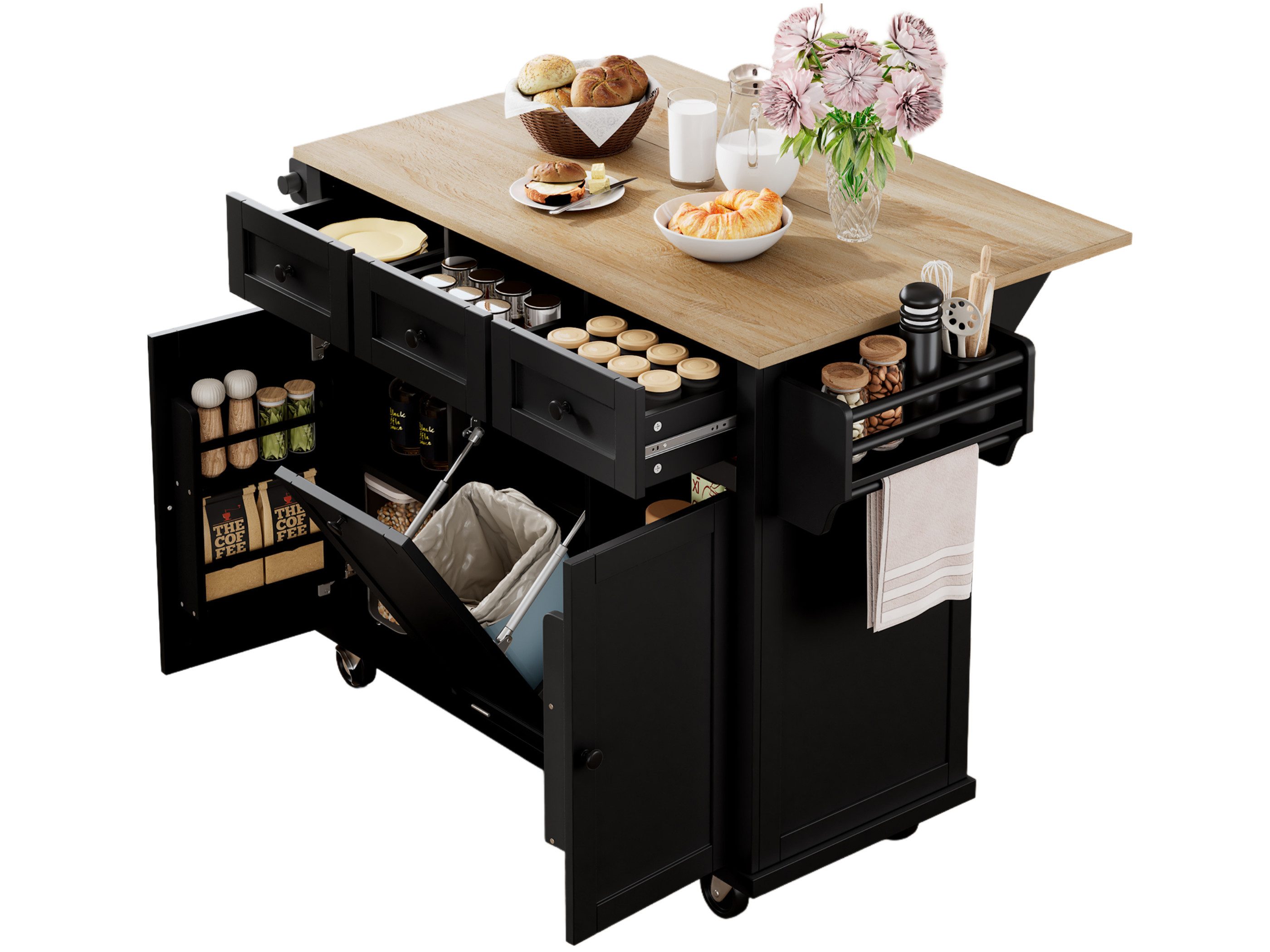 Diese Kücheninsel vereint Funktionalität, Flexibilität und Design in einem Möbelstück. Mit ihrer klappbaren Tischplatte in Holzoptik bietet sie zusätzlichen Platz zum Arbeiten oder Essen, während zahlreiche Schubladen, Türen und Regalfächer für perfekte Ordnung in der Küche sorgen. Besonders praktisch: das integrierte Mittelfach mit Mülltonnenkammer und sanft schließendem Hydraulikdämpfer. Ob mobil auf Rollen oder feststehend auf Massivholzbeinen – die Kücheninsel passt sich Ihren individuellen Bedürfnissen an. Ein echtes Multitalent, das jede Küche aufwertet und den Alltag komfortabler macht.