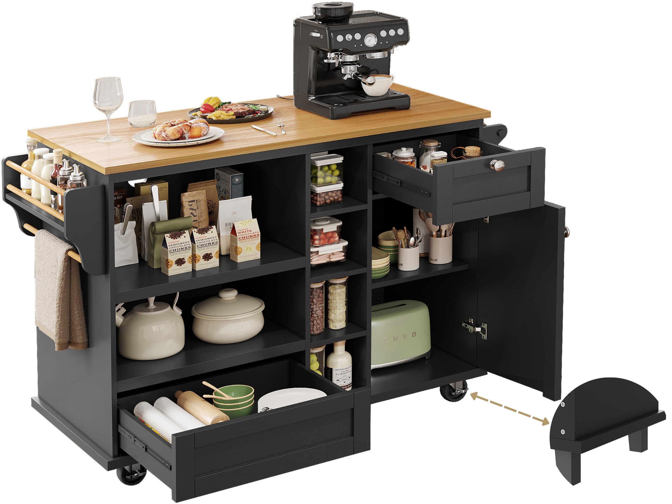 Mobil und flexibel – abnehmbare Rollen für variable Nutzung: Die Kücheninsel ist mit fünf leichtgängigen Rollen ausgestattet, die für maximale Beweglichkeit sorgen. Sie lässt sich einfach verschieben, ob beim Putzen oder Umgestalten Ihrer Küche. Все Rollen sind abnehmbar – so können Sie bei Bedarf für festen Stand sorgen. Diese Flexibilität macht die Insel zu einem vielseitig einsetzbaren Möbelstück, das sich Ihren Bedürfnissen anpasst.