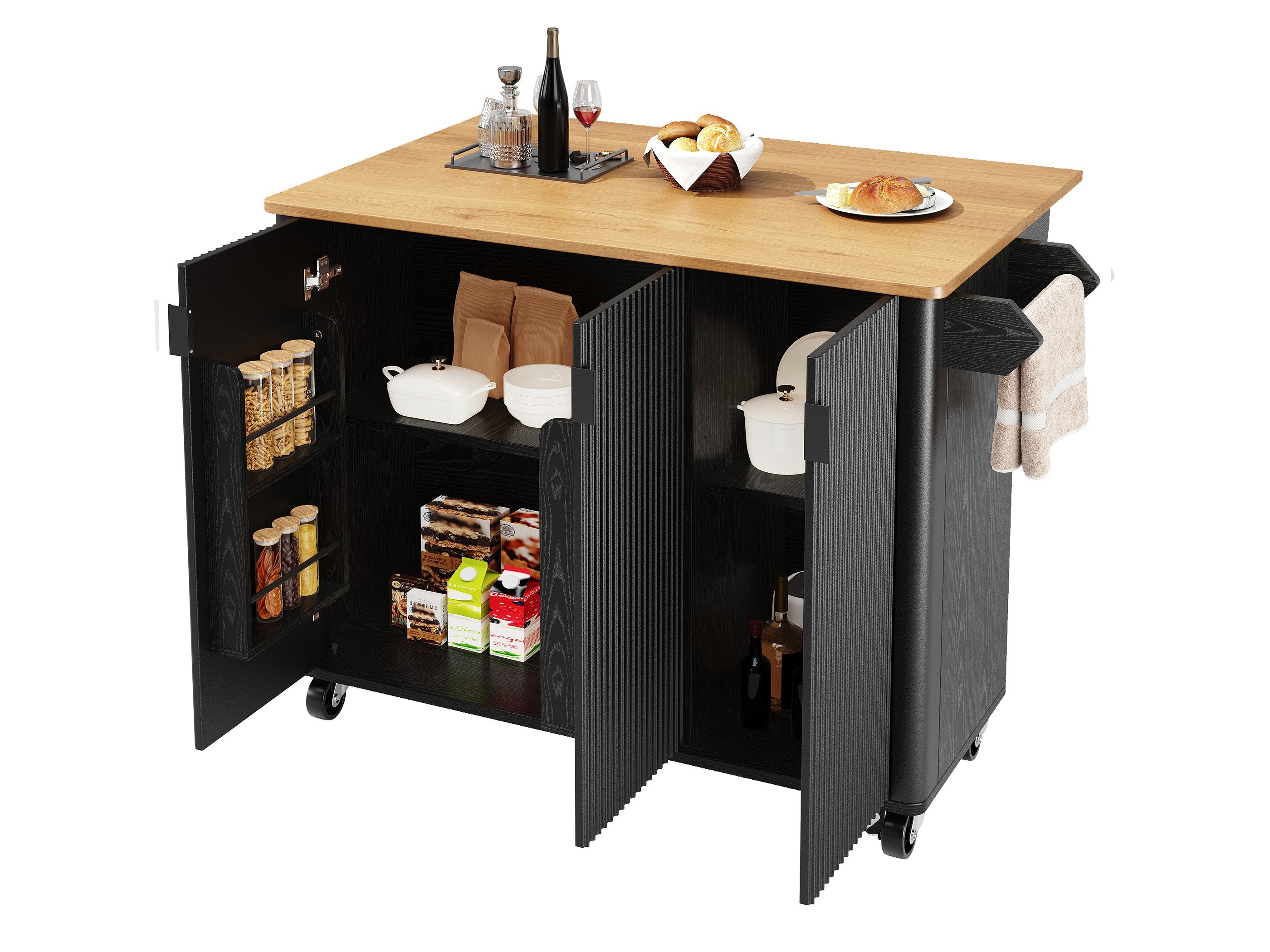 Vielseitiger Stauraum: Die Kücheninsel bietet drei Schranktüren, von denen zwei jeweils über zwei Ebenen Türregale verfügen. Die Frontplatten sind elegant gestreift gestaltet, was dem Möbelstück ein modernes Design verleiht. So lassen sich Teller, Tassen oder Vorräte übersichtlich und gut erreichbar verstauen.