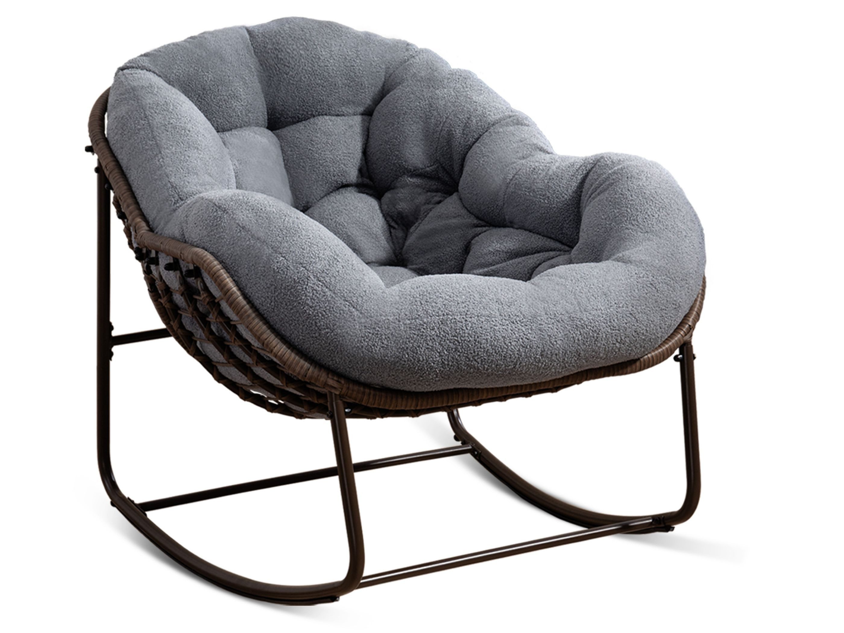 Der SeedWave Rocking Chair kombiniert modernes Design mit Komfort. Die großzügige Eierschalenform und das 15 cm dicke Kissen sorgen für ultimative Entspannung. Der Stuhl aus weichem Samtstoff und robustem Stahlrahmen eignet sich sowohl für drinnen als auch draußen. Das PE-Rattangeflecht verleiht ihm einen natürlichen, stilvollen Look.