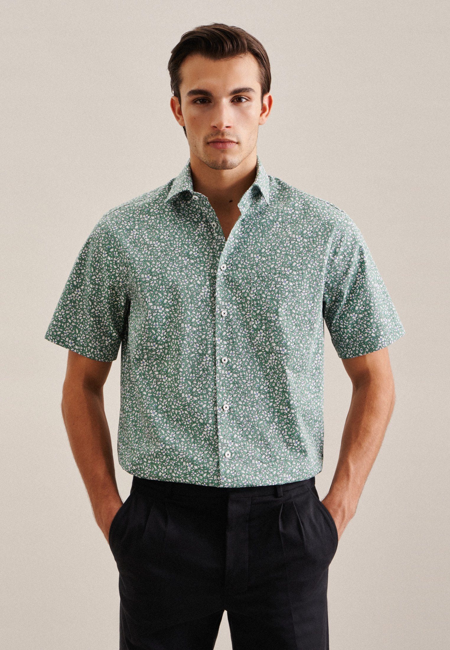 Maskuline Ästhetik: Das Business Hemd von Seidensticker aus der "SMART ESSENTIALS" Kollektion erweitert Ihre Garderobe um ein vielseitig einsetzbares Kleidungsstück. Es ist ein vielseitiger Begleiter, der sich ideal für Freizeit, Homeoffice, Büro oder Veranstaltungen eignet und zu jeder Gelegenheit getragen werden kann. Popeline wird mit hoher Dichte gewebt und ergibt daher ein extrem widerstandsfähiges Material. In Kombination mit 100% Baumwolle ist es bestens geeignet für pflegeleichte Business-Outfits. Durch seinen Schnitt in Regular fit liegt das Business Hemd weniger eng und eher leger an und bietet so einen optimalen Tragekomfort. Das attraktive florale Muster setzt optische Akzente. Smarte Modernität mit formellen und legeren Aspekten prägt dieses Hemd von Seidensticker. An schönen warmen Tagen liegen Sie mit diesem Kurzarm-Business Hemd immer goldrichtig. Durch den Kentkragen wird der universelle Business-Charakter unterstrichen. Zusätzlich ist eine Brusttasche aufgenäht worden.