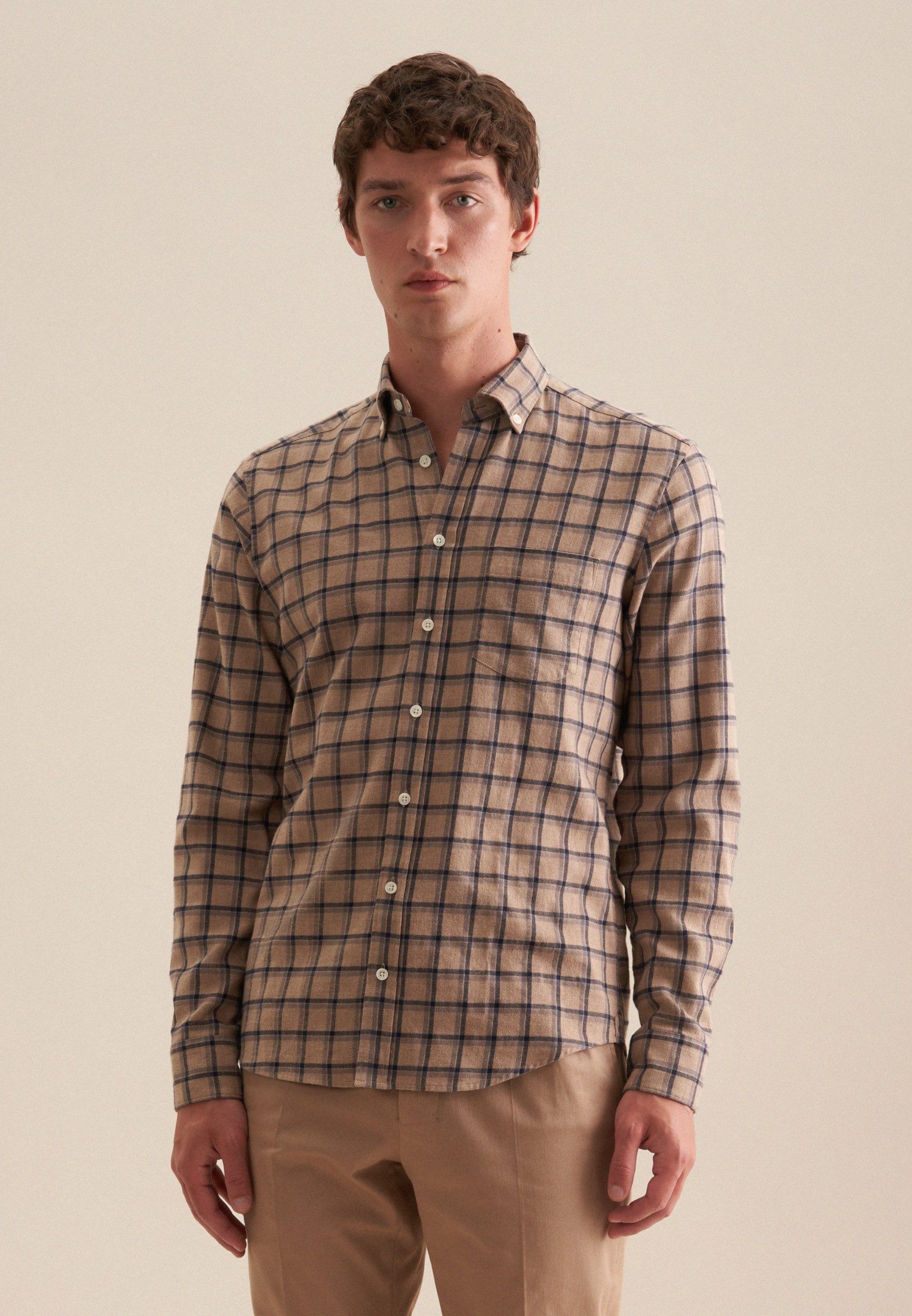 Maskuline Ästhetik: Das Casual Hemd von Seidensticker aus der "SMART CASUAL" Kollektion erweitert Ihre Garderobe um ein vielseitig einsetzbares Kleidungsstück. Ob Veranstaltungen, Homeoffice, Freizeit oder Büro - es ist ein eleganter Begleiter, der durch schlichte Eleganz überzeugt. Der locker-leicht gewebte und für seinen angenehm weichen Griff beliebte Flanell ist aus 100% Baumwolle und besonders widerstandsfähig sowie für smarte Business Looks als auch für formelle Outfits geeignet. Als Regular Schnitt liegt das Casual Hemd leger und weniger eng an und schafft optimalen Tragekomfort. Durch das Karo-Muster ist Ihr neues Kleidungsstück elegant und zugleich modisch. Dieses Hemd verkörpert zeitlose Eleganz mit modernem Schliff. Für Liebhaber von eleganten Looks ist dieses Langarm-Casual Hemd eine gute Wahl. Weitenverstellbare Manschetten runden das Bild ab. Besonders herausgearbeitet wird der sportlich-moderne Charakter durch einen Button-Down-Kragen. Eine Brusttasche wirkt als unaufdringliches Detail.