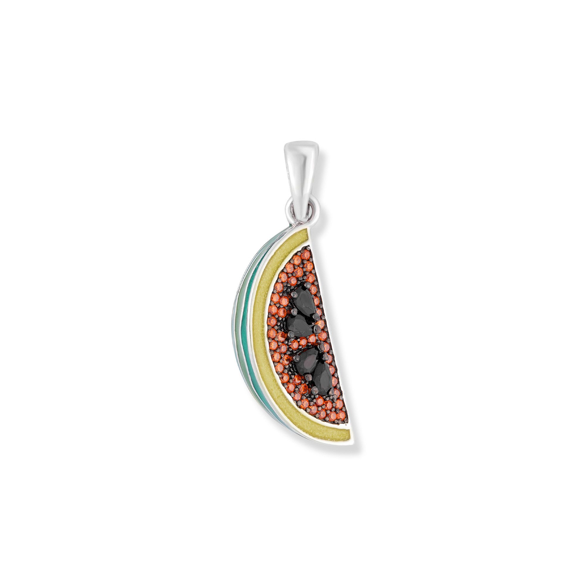 Der Melo Melonen Anhänger ist ein frischer und sommerlicher Anhänger, der aus hochwertigem 925 Sterling Silber gefertigt und mit einer glänzenden Rhodium-Beschichtung versehen wurde. Das Design des Anhängers wird durch die lebendige grüne Emaille hervorgehoben, die die Frische und Natürlichkeit einer saftigen Melone symbolisiert. Die rötlich gefassten Zirkonia-Steine verleihen dem Anhänger einen Hauch von Funkeln und sorgen für einen eleganten Akzent. Mit seinem charmanten und verspielten Erscheinungsbild ist der Melo Melonen Anhänger ein perfektes Accessoire, um Ihren Sommer-Look zu ergänzen und Ihre Liebe zur Natur und zum fruchtigen Genuss auszudrücken. Tragen Sie diesen Anhänger mit Stolz und zeigen Sie Ihre Leidenschaft für stilvollen und trendigen Schmuck. Genießen Sie den Sommer mit diesem erfrischenden und einzigartigen Schmuckstück, das Ihre Persönlichkeit und Ihren individuellen Stil zum Ausdruck bringt.