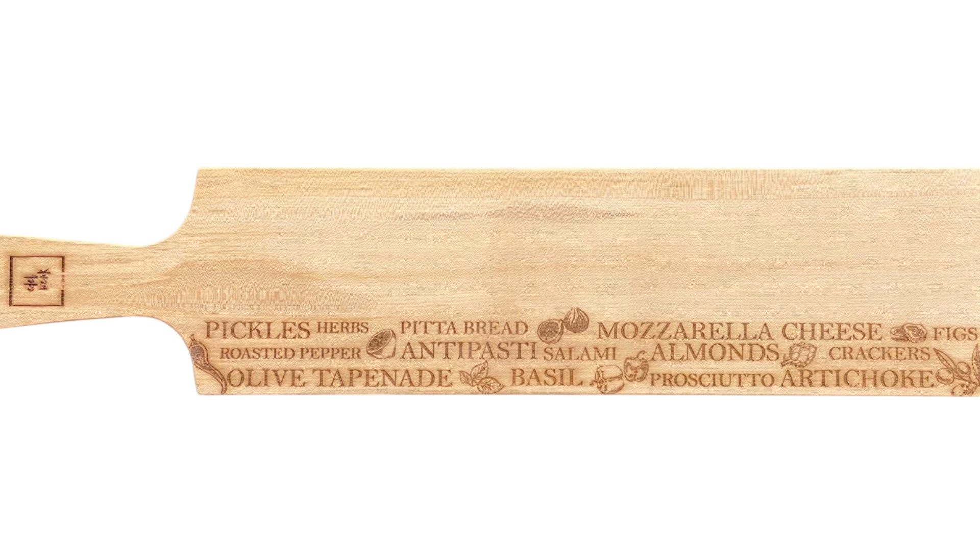 Olive Tapenade wurde in einer einzigartigen und stilvollen Schrift auf diese Tafel eingraviert und ist neben handgezeichneten Zeichnungen handwerklicher Lebensmittel und anderen Schriftzügen wie Mozzarella, Cheese, Crackers usw. abgebildet. Unser schottisches Bergahorn Antipasti-Servierpaddel bietet eine unterhaltsame und zeitgemäße Möglichkeit, Ihre Lieblings-Antipasti-Auswahl zu servieren. Mit seinem atemberaubenden schlanken und langgestreckten Design können Sie eine großzügige Auswahl für alle zusammenstellen.