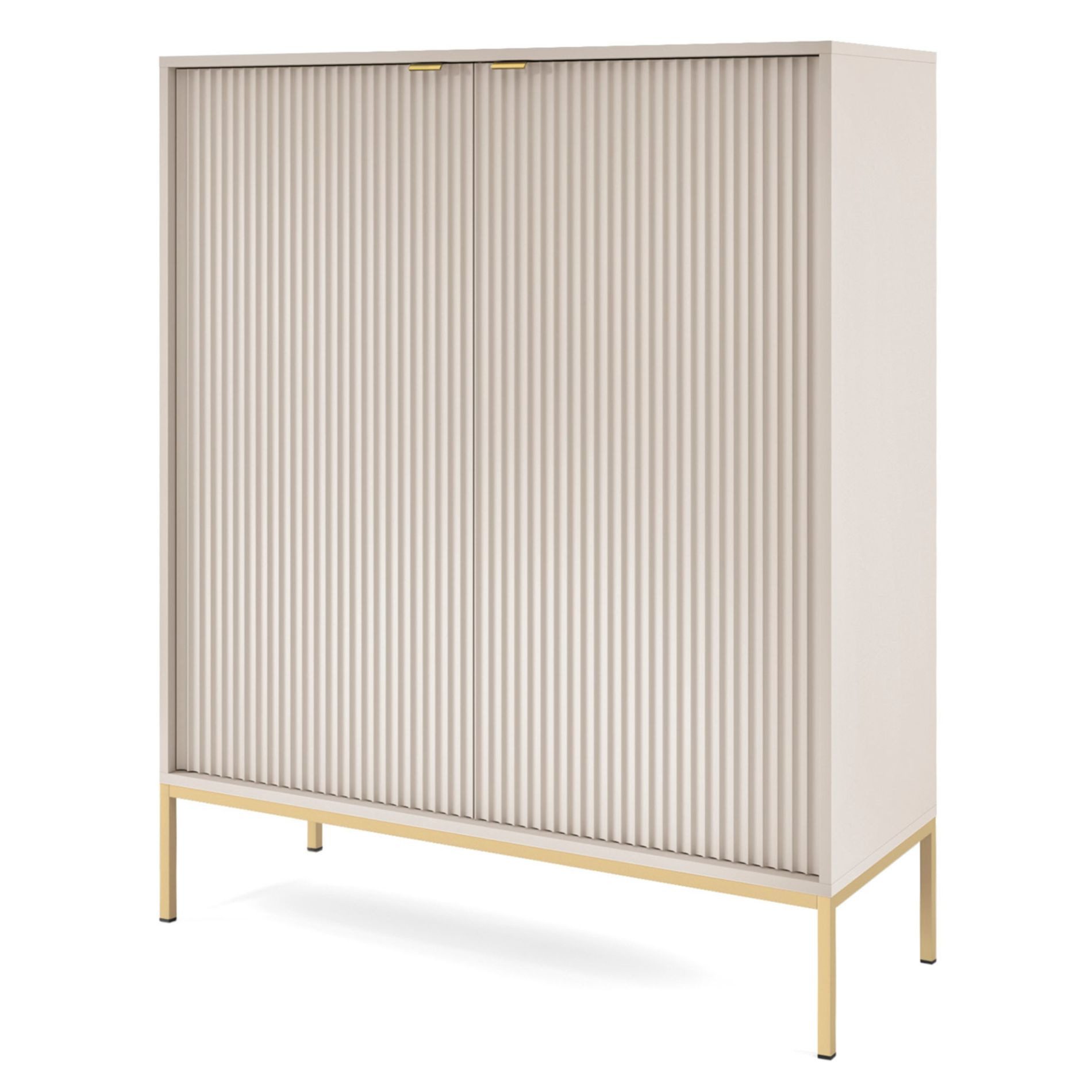 Das Highboard Vellore vereint modernen, minimalistischen Stil mit eleganten Details. Seine klaren Linien und das geometrische Design des Gestells schaffen eine zeitlose Ästhetik, die in jedes Zuhause passt. Ein glänzendes Gestell in Gold setzt dazu einen edlen Akzent. Die geriffelten Fronten verleihen dem Sideboard zusätzliche Tiefe und Struktur, während die schmalen, goldenen Griffe das Design abrunden und den luxuriösen Charakter unterstreichen.