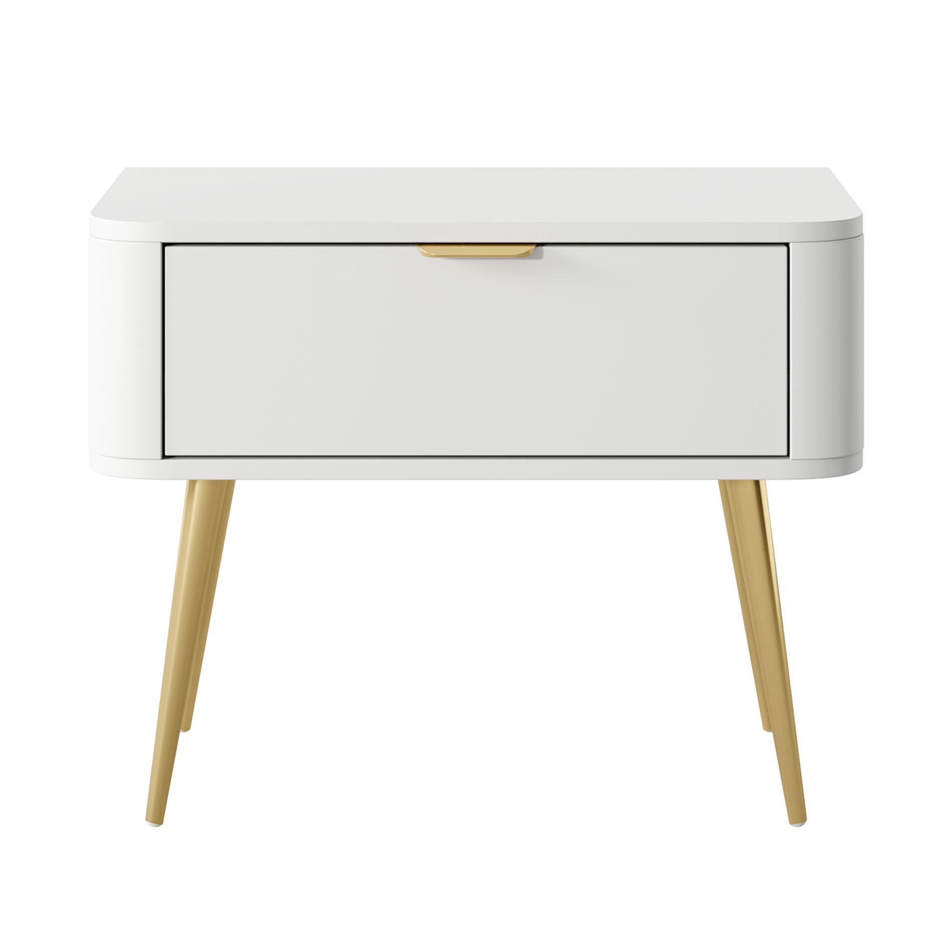 Der Nachttisch Oval ist ein elegantes Möbelstück, das im Schlafzimmer für einen modernen Touch sorgt. Mit seinen klaren Linien, abgerundeten Kanten und den schlanken, goldfarbenen Metallfüßen bringt er zeitlosen Stil in Ihre Einrichtung. Der Nachttisch verfügt über eine praktische Schublade mit einem goldfarbenen Metallgriff, die ausreichend Platz für Bücher, Brillen oder andere Kleinigkeiten bietet und für Ordnung sorgt.