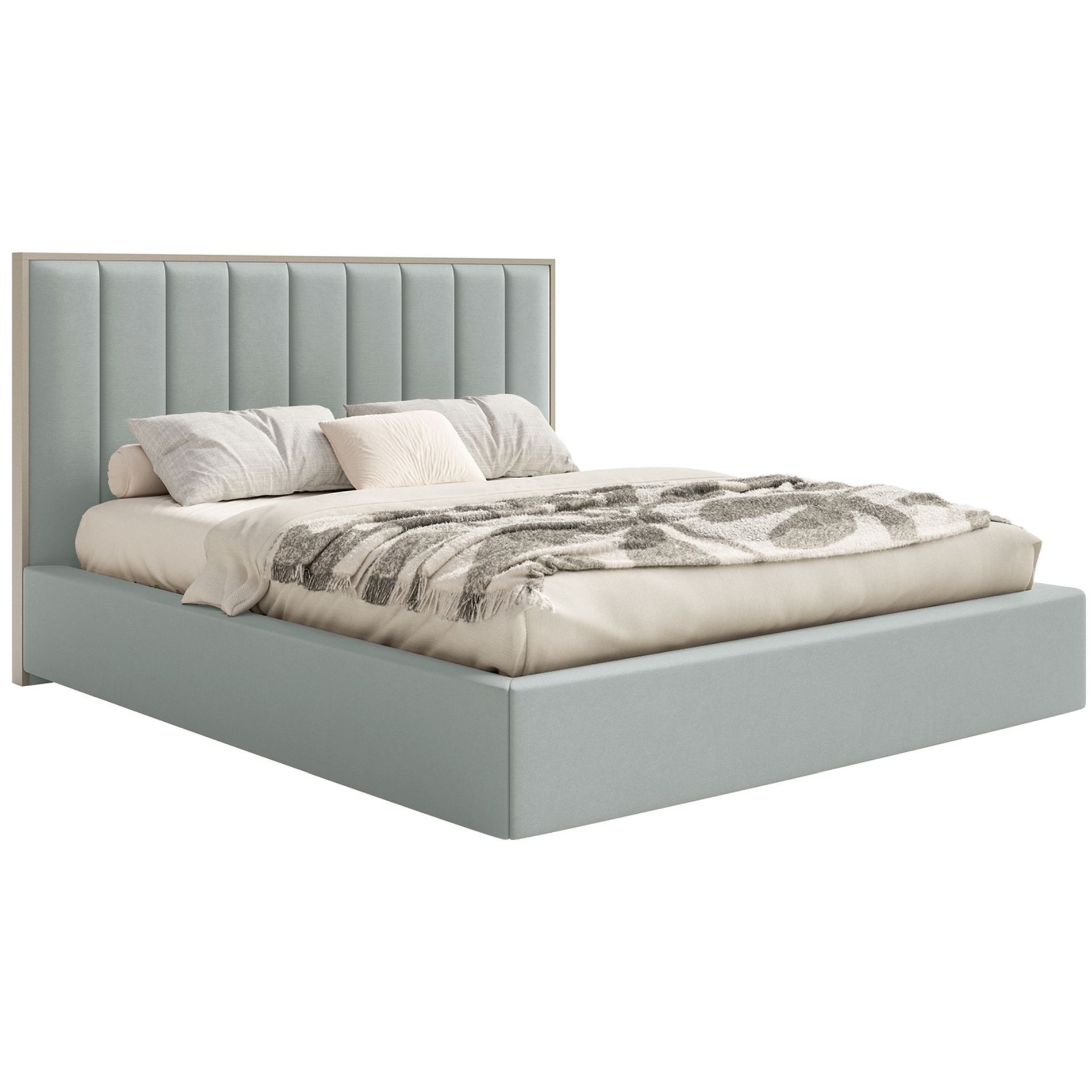 Das vertikal gesteppte Kopfteil sorgt mit seiner weichen Polsterung für besonderen Komfort und wird durch eine edle Möbelplatte in Kaschmirgrau am Rand ergänzt. Die Kombination aus Stoff und dekorativem Element verleiht dem Bett eine moderne Tiefe und stilvolle Eleganz.