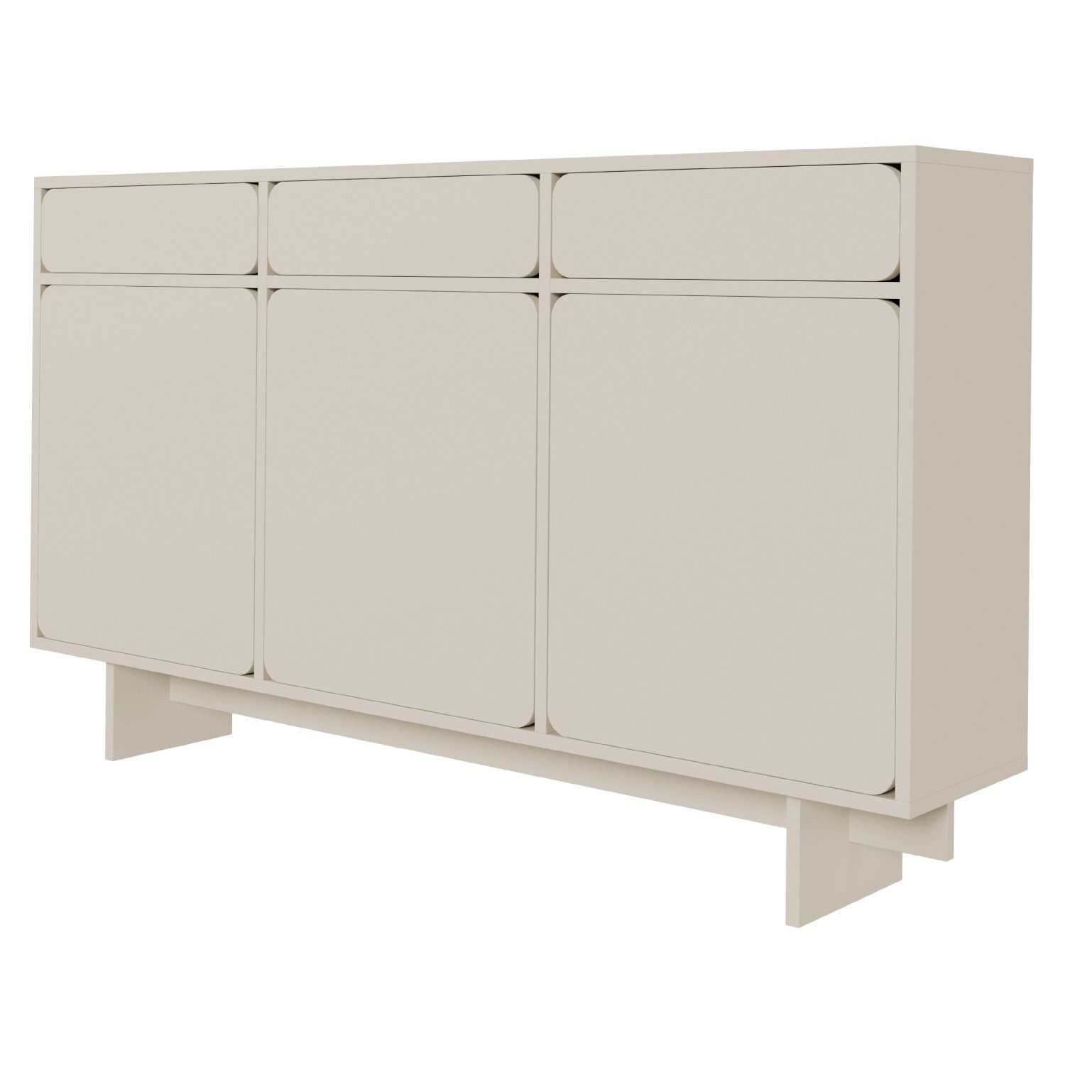 Ein besonderes Highlight der Kollektion ist das dreitürige Sideboard mit Push-to-Open-Funktion, das modernes Design und hohe Funktionalität vereint. Es verfügt über drei Türen und drei praktische Schubladen, die einen optimalen Stauraum für Bücher, Geschirr, Kleidung oder andere Gegenstände bieten. Das grifflose Design und die geriffelten Fronten verleihen dem Möbelstück einen zeitlosen Look, während die hochwertige Verarbeitung Langlebigkeit und Stabilität garantiert. Dieses Sideboard kombiniert ein klares Design mit vielseitigen Stauraummöglichkeiten und passt perfekt in jeden Raum.