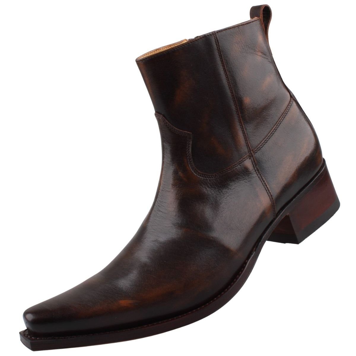 Klassisch schlichtes Design überzeugt bei dieser Lederstiefelette im Westernstyle. Markant ist die lang gezogene Schuhspitze in Karreè-Form. Über den innenseitig angebrachten Reißverschluss gelangen Sie bequem in den Stiefel. Der Innenschuh besteht aus einem Leder-Textil-Mix und sorgt für allerbesten Tragekomfort.