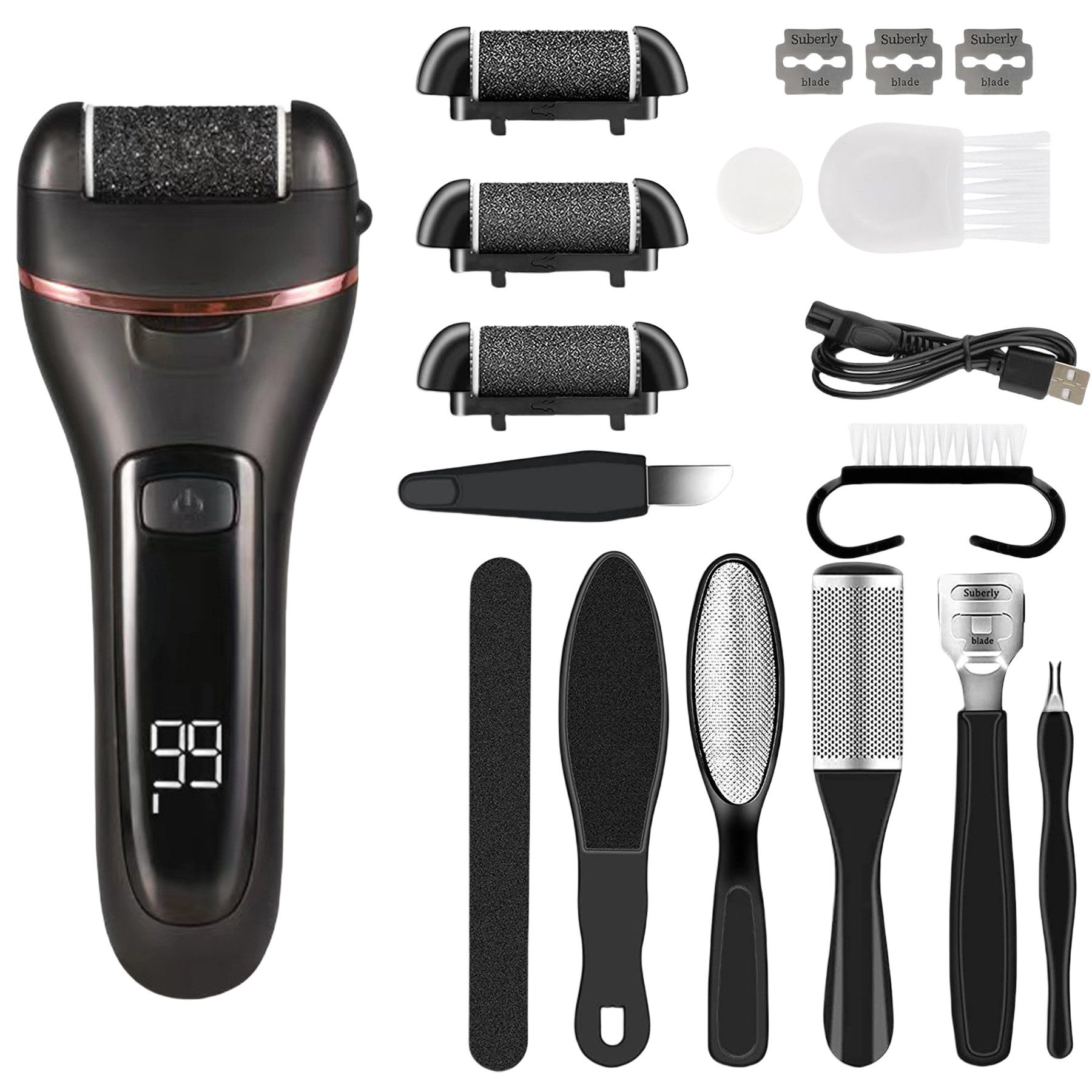 Drei Arten von abrasiven Partikelrollenköpfen mit unterschiedlichem Grad, um das Problem der abgestorbenen Haut und Schwielen unterschiedlicher Dicke an den Füßen zu lösen.