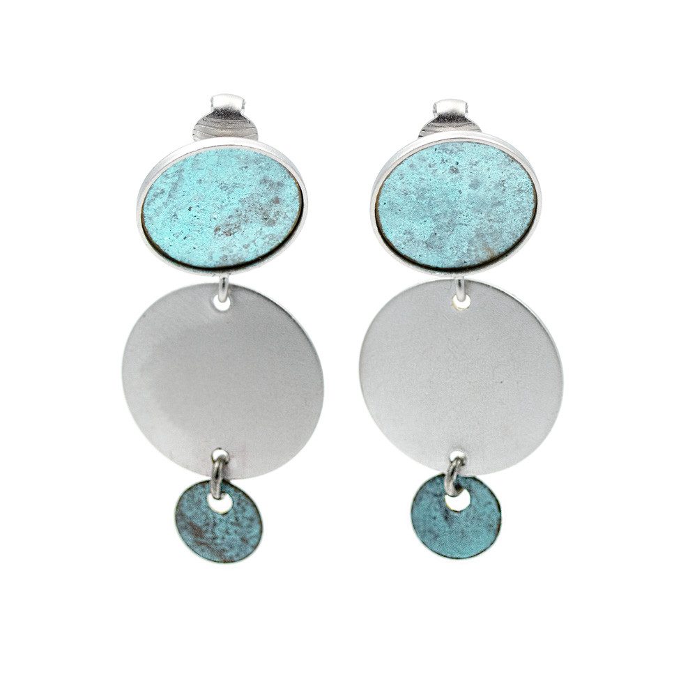 Handgefertigter Ohrclip mit dreiteiligem Design, farbig patinierten und metallischen Plättchenanhängern – einzigartig und stilvoll