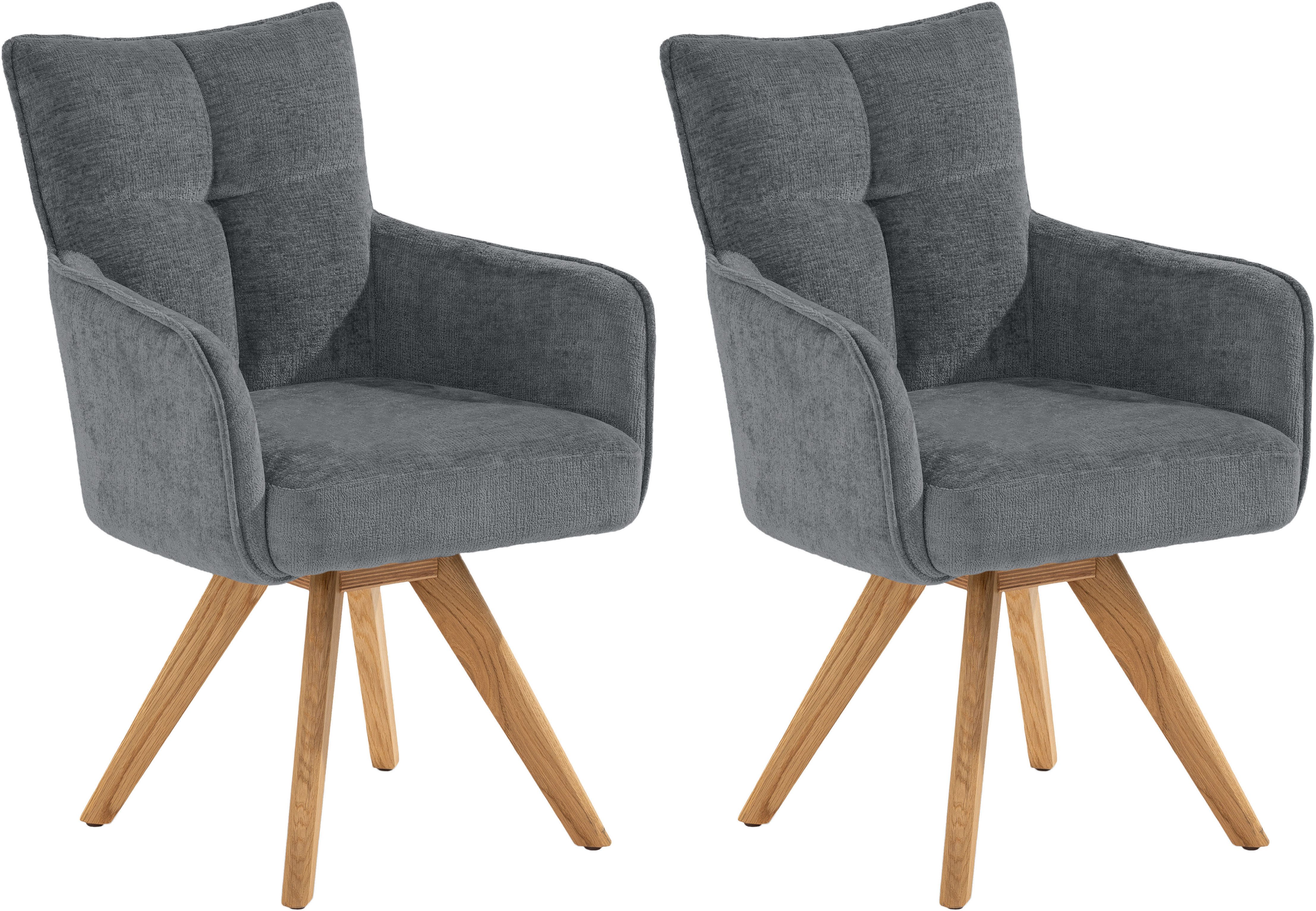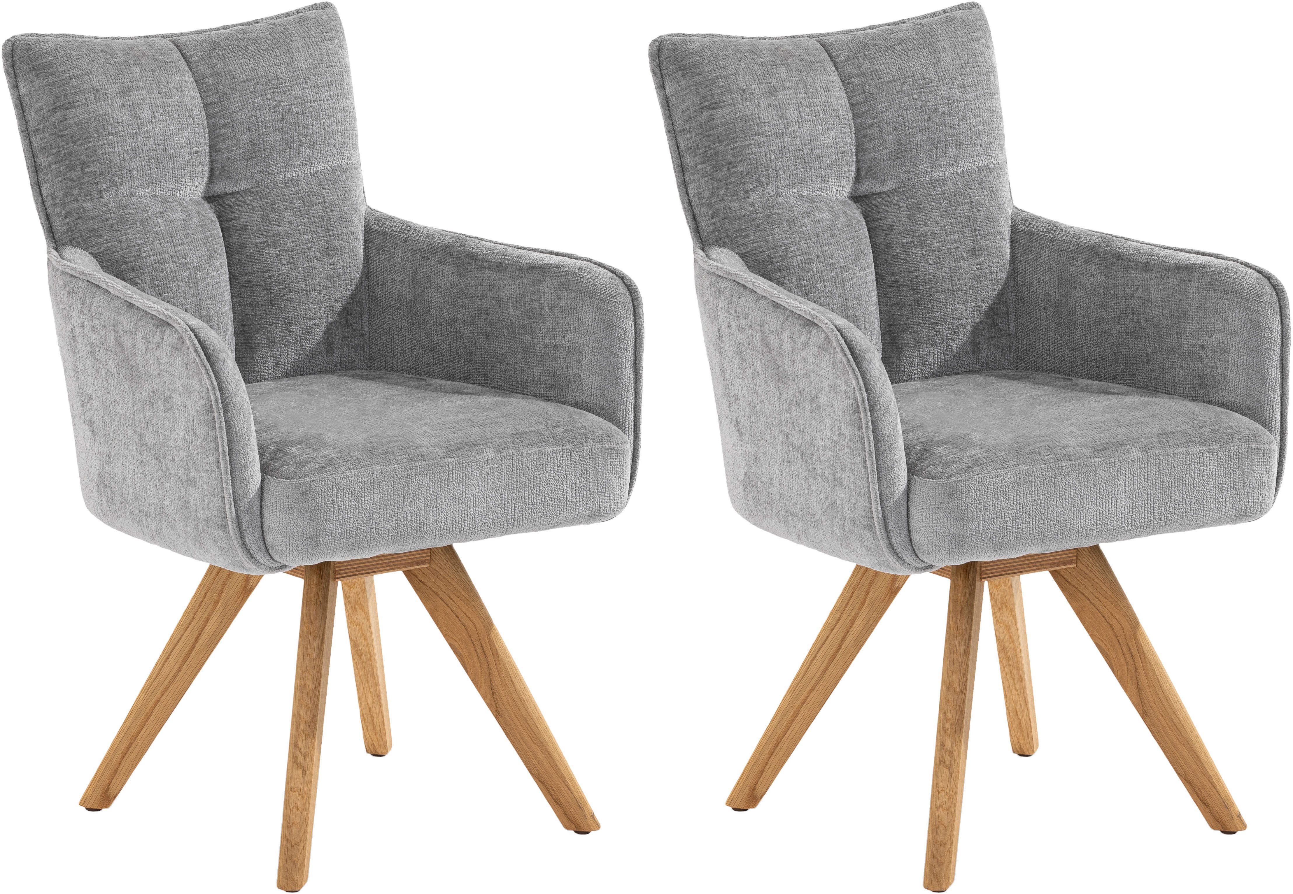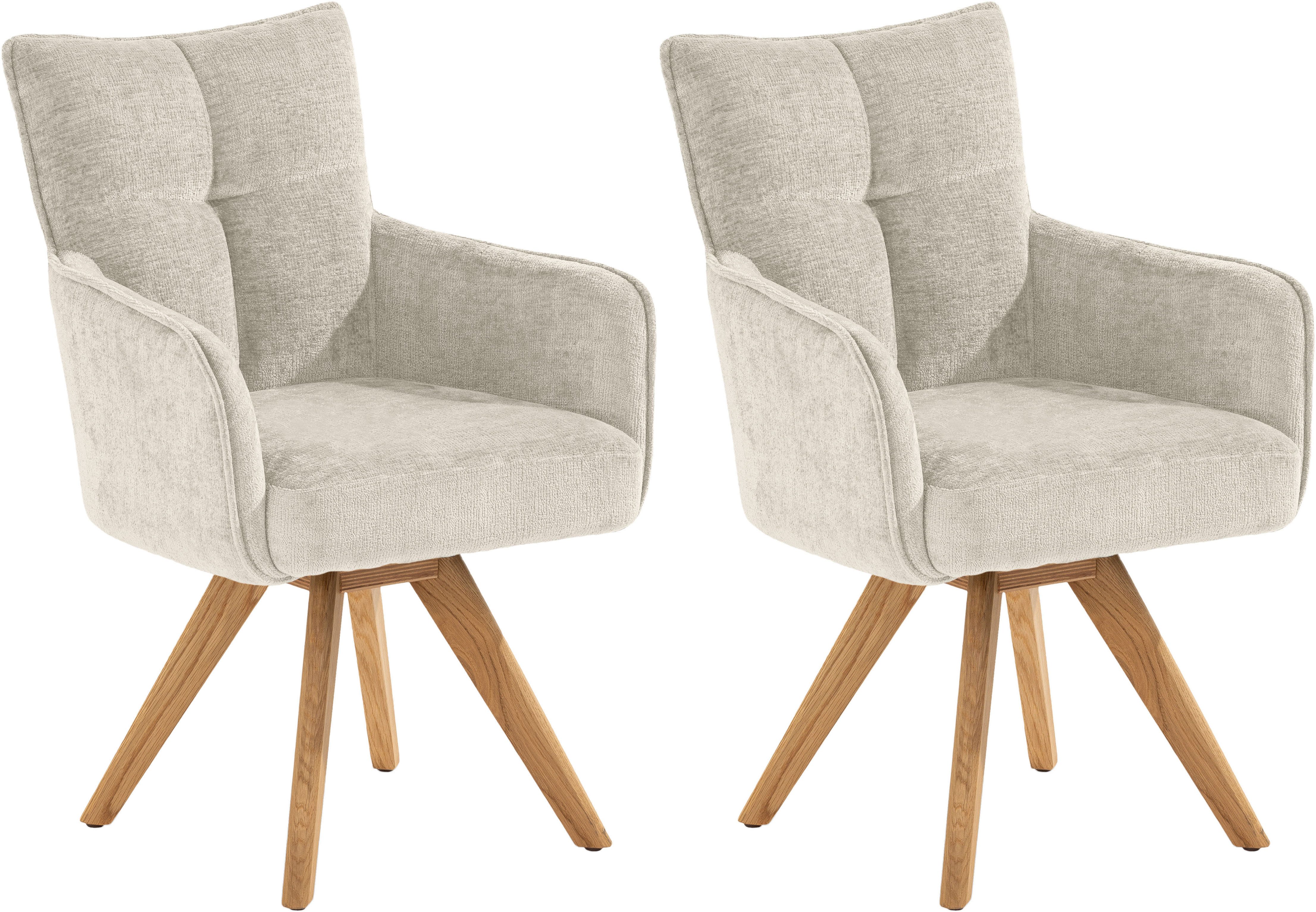 Diese Armlehnstühle »Tucson« von set one by Musterring fallen optisch sofort ins Auge und werden dich auch nicht enttäuschen, wenn es um Beständigkeit geht. Ohne den Stuhl anheben und verschieben zu müssen, kann dank der Drehfunktion ganz leicht Platz genommen werden. Praktisch ist das insbesondere in etwas kleineren Räumen. Auch wenn du länger sitzen bleibst, ist er komfortabel, denn sowohl die Arm- und Rückenlehne als auch die Sitzfläche sind angenehm gepolstert. Die maximale Belastbarkeit liegt bei einem Gewicht von 142 Kilogramm.