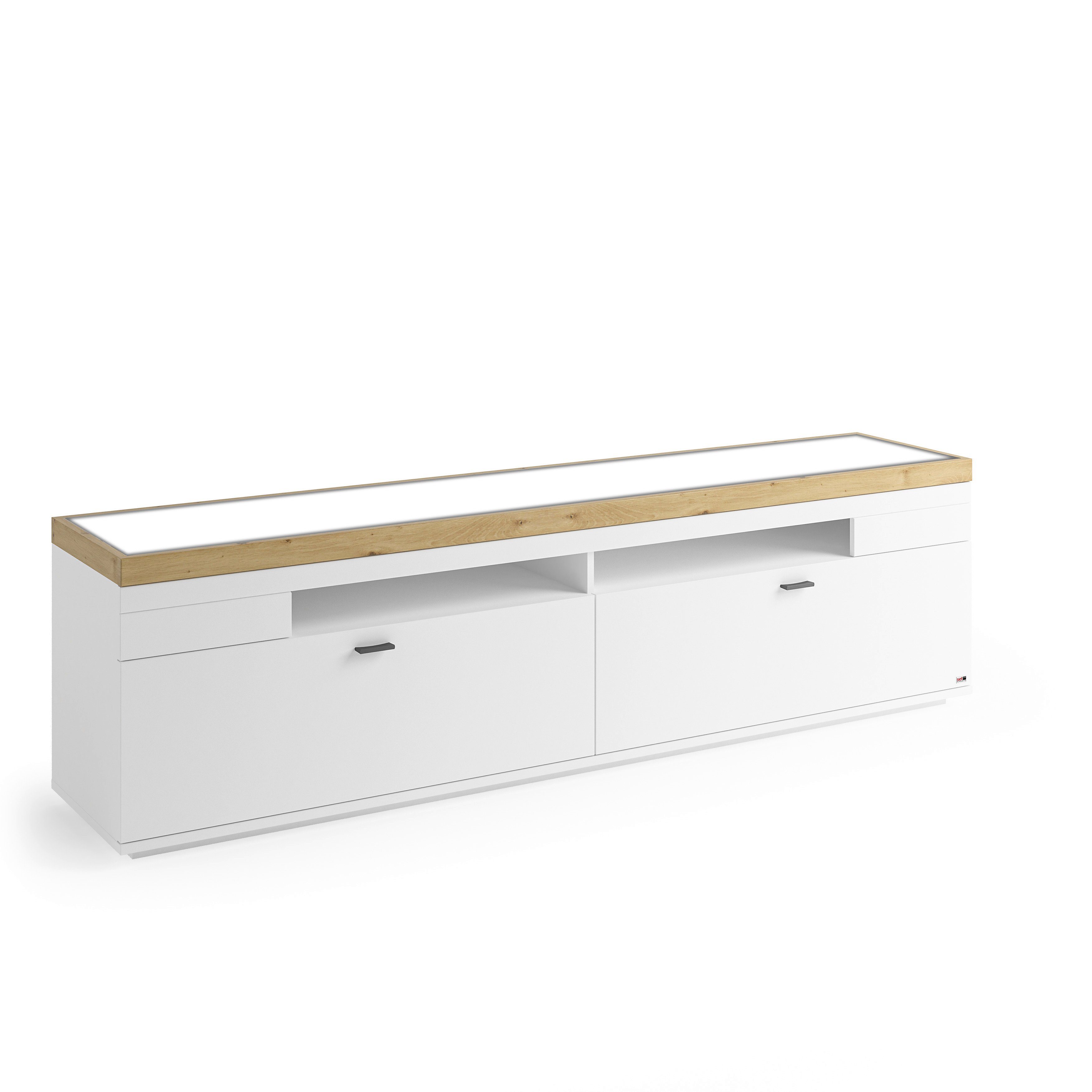 Stilvolle Medienaufbewahrung mit dem Set One Lancaster TYP 34 Lowboard Das Set One Lancaster TYP 34 Lowboard in Weiß/Eiche Artisan ist nicht nur ein funktionales Möbelstück, sondern auch ein ästhetisches Statement für Ihr Zuhause. Mit seinem zeitgemäßen Design und der gelungenen Kombination aus Weiß und Eiche verleiht es Ihrem Wohnzimmer eine zeitlose Eleganz. Vielseitige Aufbewahrungsmöglichkeiten Mit einer Breite von 210 cm, einer Tiefe von 44 cm und einer Höhe von 60 cm bietet dieses Lowboard reichlich Platz für Ihre Medien- und Aufbewahrungsbedürfnisse. Es verfügt über ein Glas-Abdeckblatt mit Rahmen in Absetzung, das von LED-Beleuchtung begleitet wird und Ihrem Wohnzimmer eine stimmungsvolle Atmosphäre verleiht. Das Lowboard bietet zudem zwei offene Fächer und vier Schubkästen an zwei Fronten, die Platz für Ihre Multimedia-Geräte, Filme, Bücher und vieles mehr bieten. Hochwertige Materialien und 5 Jahre Garantie Das Lowboard ist aus hochwertigem Holzwerkstoff gefertigt und überzeugt durch seine solide Verarbeitung. Sowohl der Korpus als auch das Gestell sind in Weiß gehalten und strahlen moderne Eleganz aus. Set One by Musterring gewährt großzügige 5 Jahre Garantie auf dieses Möbelstück, was seine Langlebigkeit und Qualität unterstreicht. Verleihen Sie Ihrem Wohnzimmer einen Hauch von Luxus und organisieren Sie Ihre Medien und Wohnaccessoires stilvoll mit diesem eleganten Lowboard. Nicht im Lieferumfang: Trafo (im Cross-Seeling enthalten)