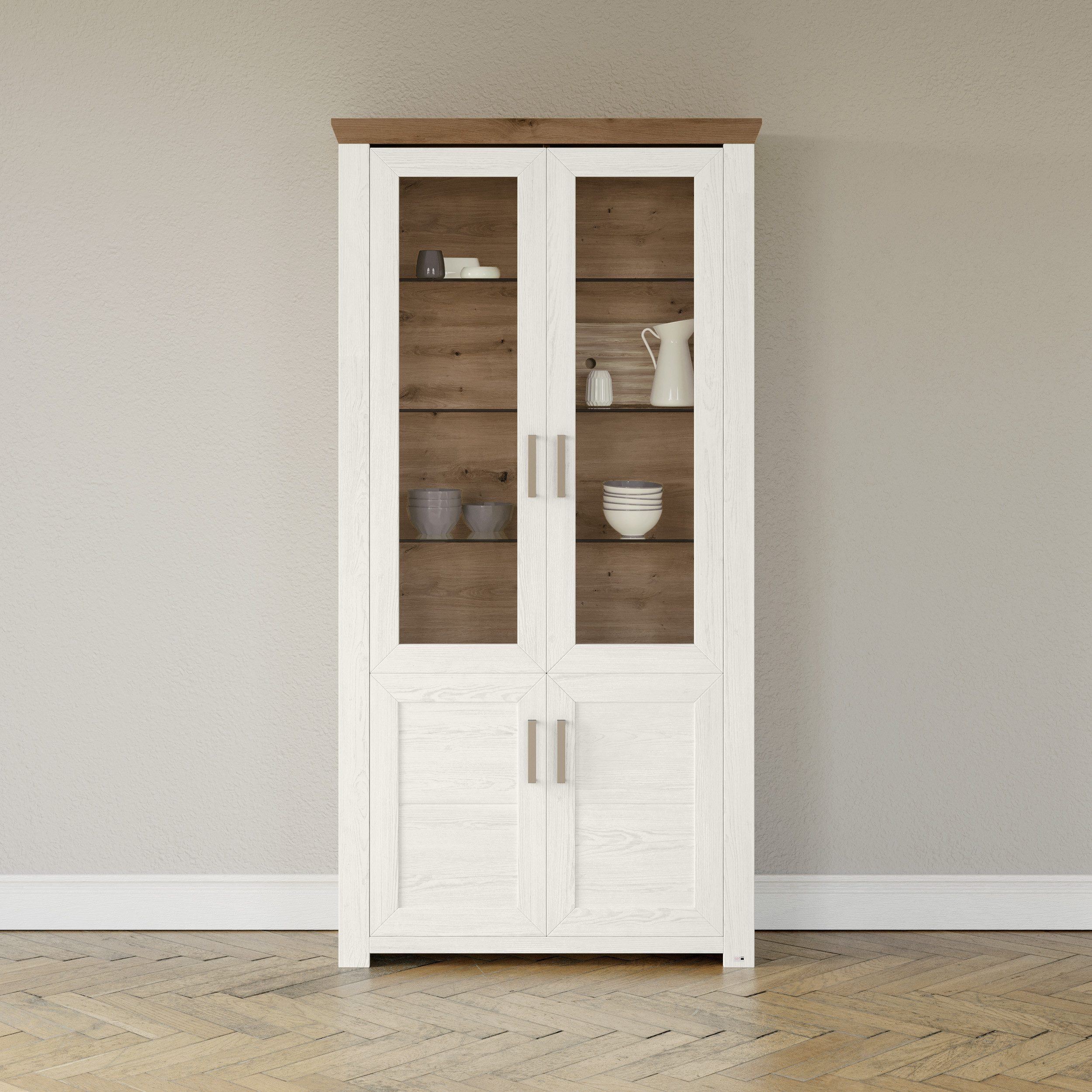 Die Standvitrine versprüht eine ländliche Romantik. Zum Beispiel in Kombination mit Möbeln aus Holz oder Rattan wird das heimelige Ambiente stilecht ergänzt. Auflockernde Farbtupfer können beispielsweise mit Deko-Elementen wie bunten Vasen oder Kerzen eingebracht werden. Er ist Teil der York Serie. Впередe Artikel hieraus lassen sich besonders gut dazu kombinieren.