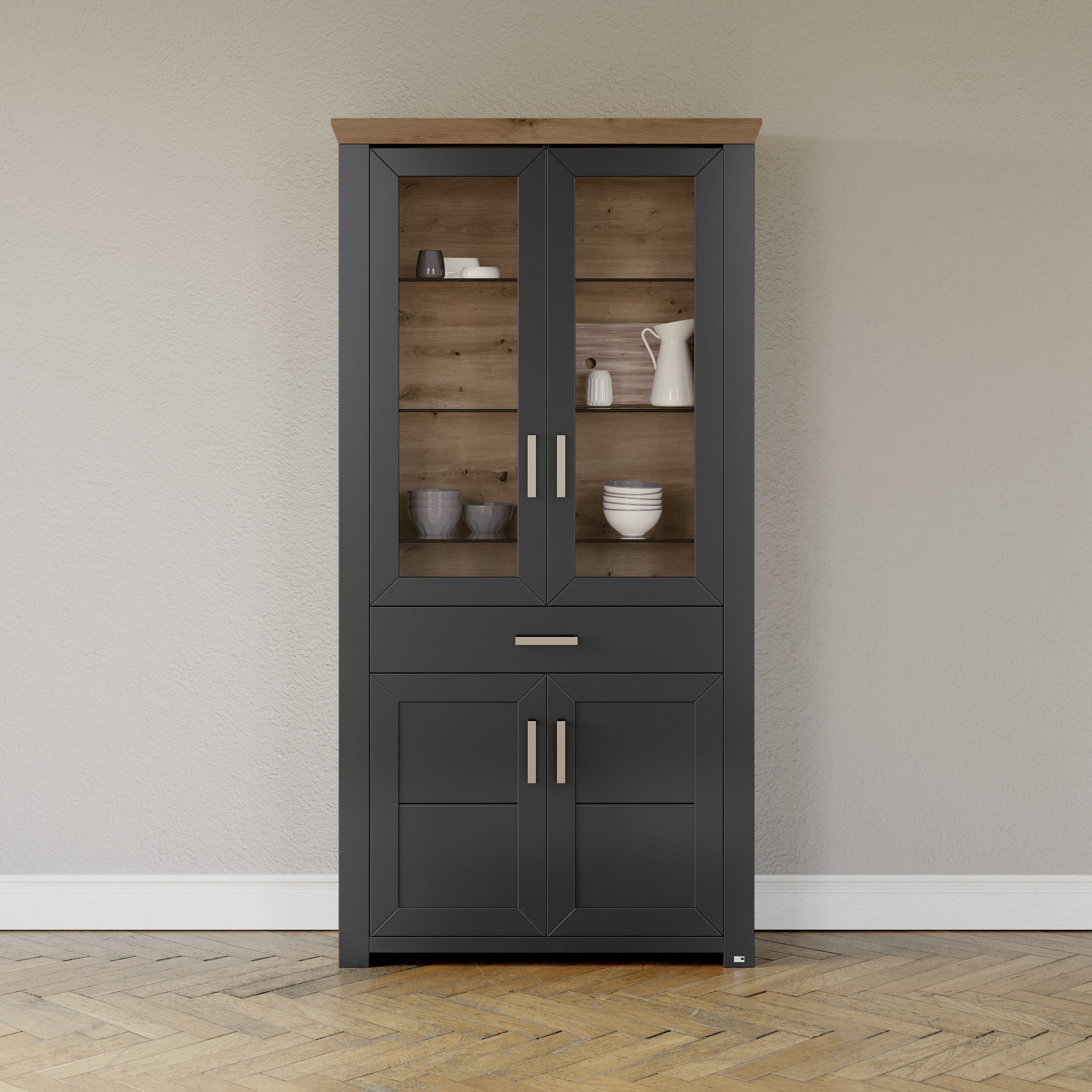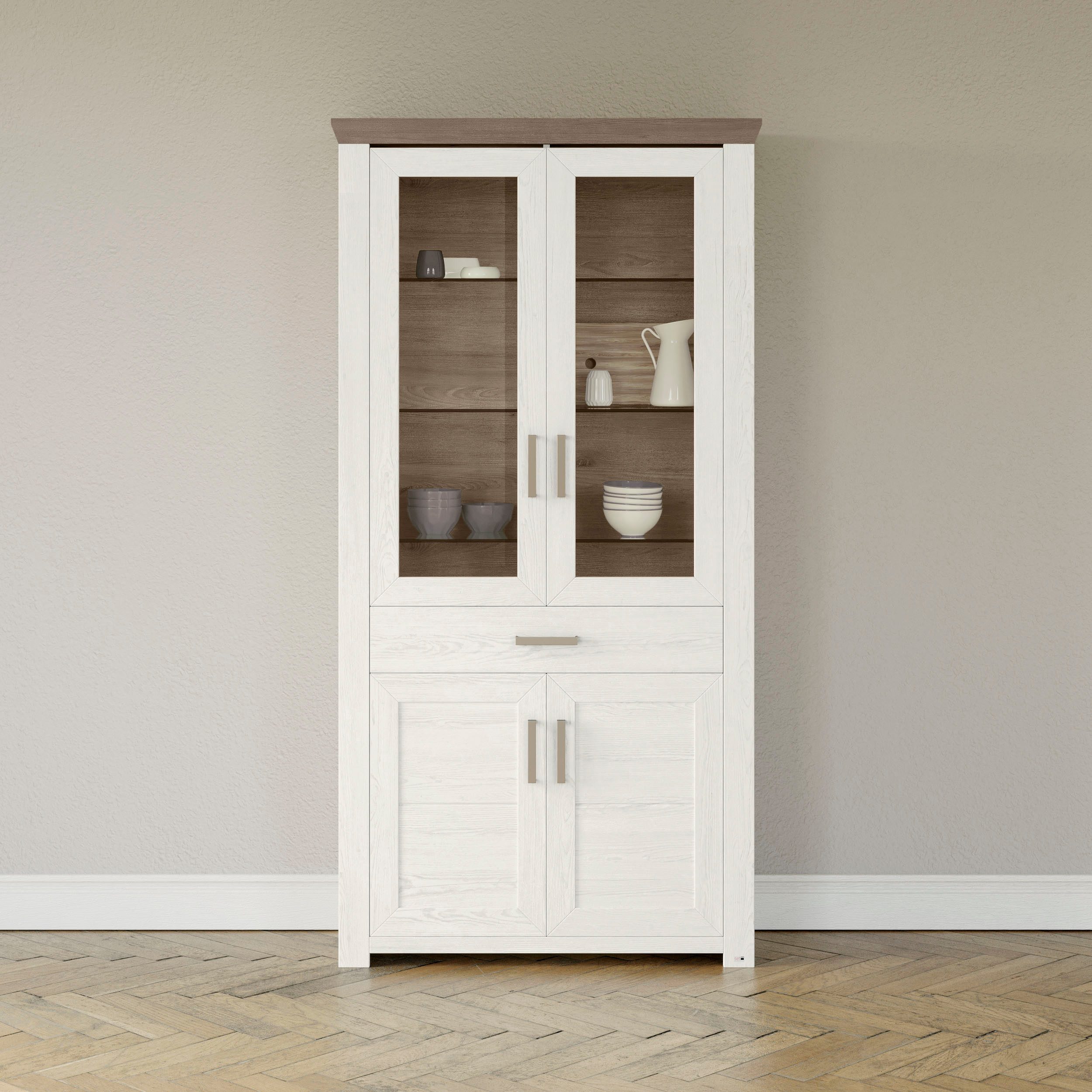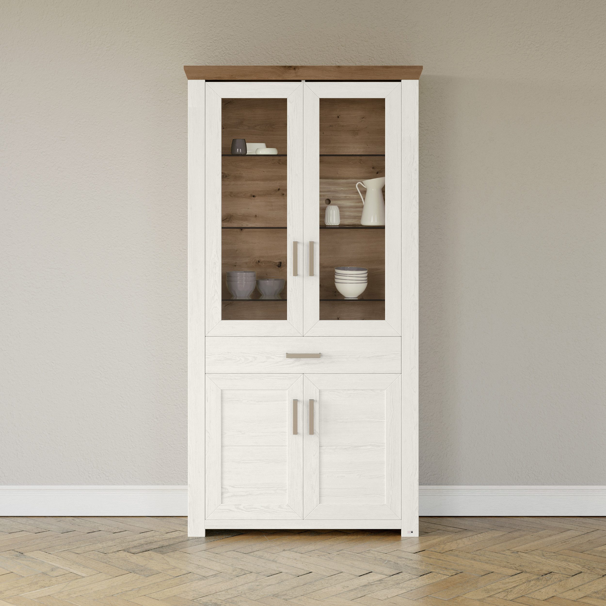 Den gemütlichen Landhausstil der Standvitrine in der Inneneinrichtung nochmal aufzugreifen oder zu unterstreichen ist ganz einfach: Das Holz passt gut zu anderen Naturmaterialien und zarten Farben wie Creme, Beige oder Grau. Dekorieren kannst du unter anderem mit Porzellan- oder Tonelementen, um das zwanglose Landhaus-Flair zu unterstreichen. Er ist Bestandteil der Serie York. Von dieser kannst du dich beim Einrichten inspirieren lassen.