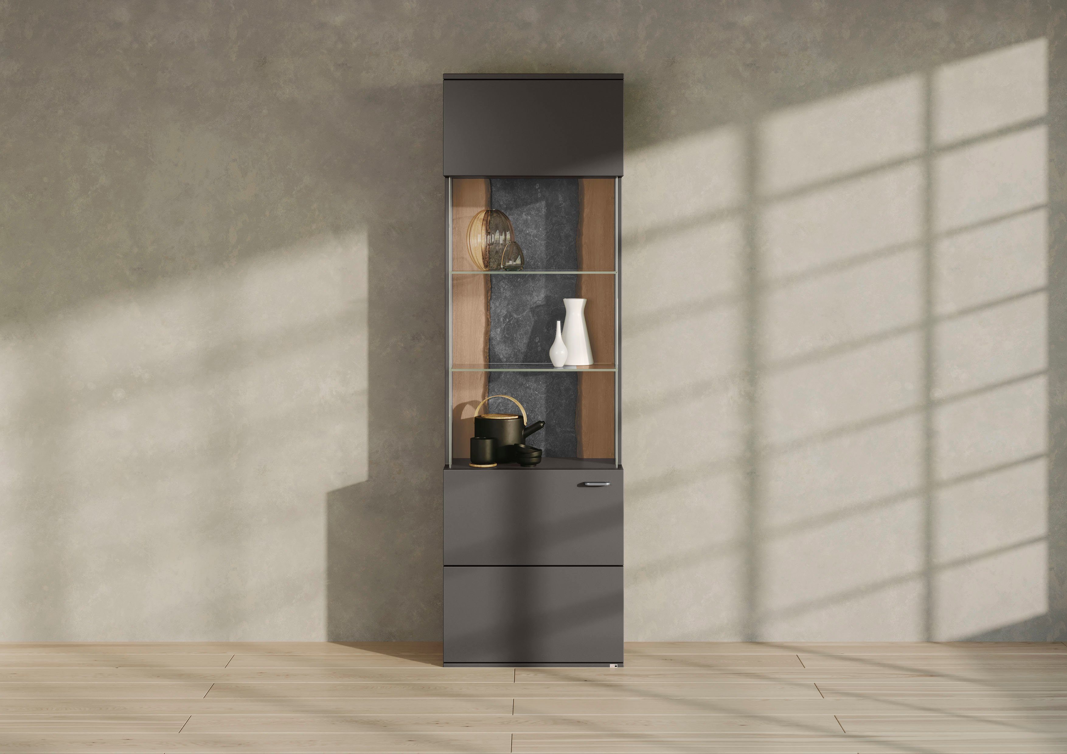 Wissenswertes | Sichtbare Rückwände aus Rindenholz Eiche, massiv mit Elementen aus Schiefer Optik Dübel und Schrauben für die Mauer sind nicht im Lieferumfang enthalten Glastür getönt Korpus: Melaminbeschichtet |