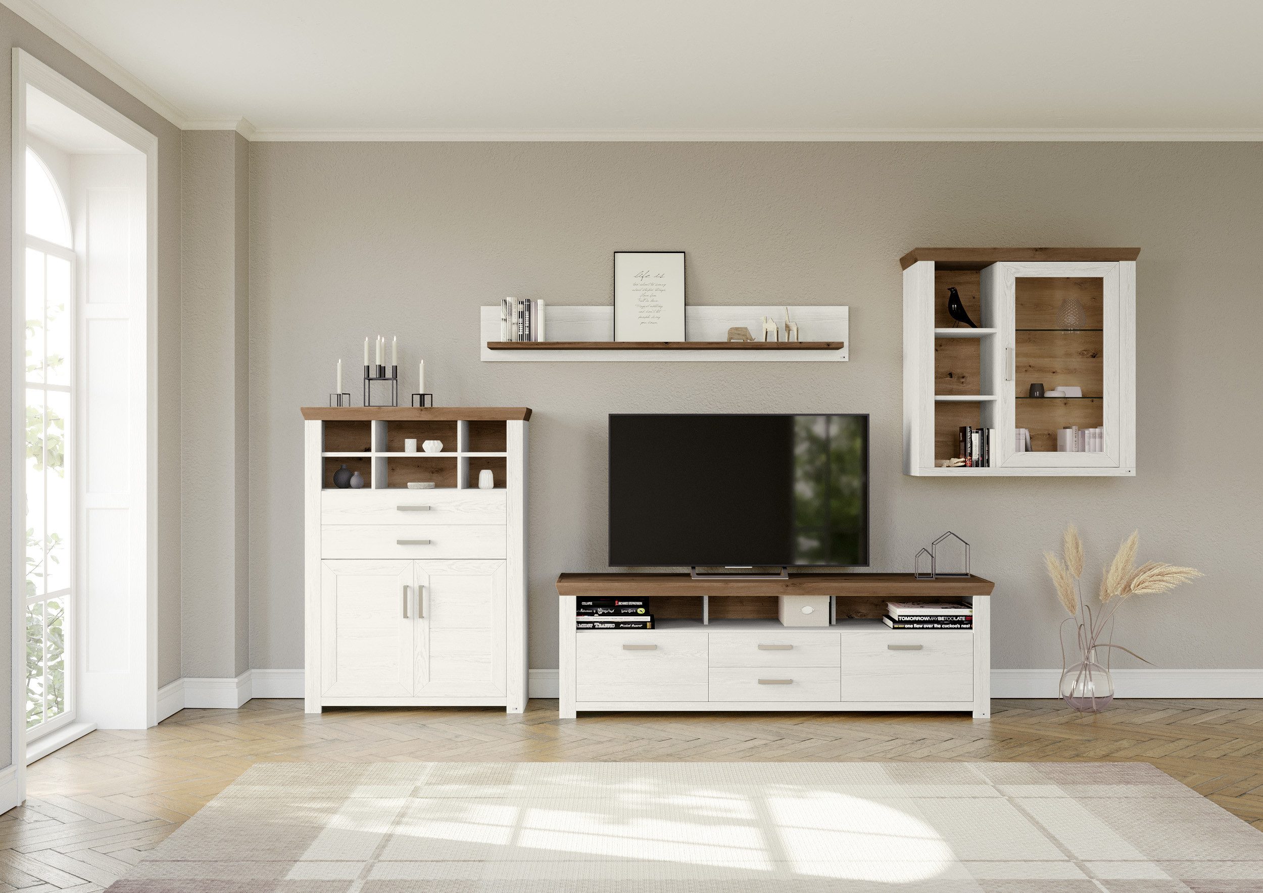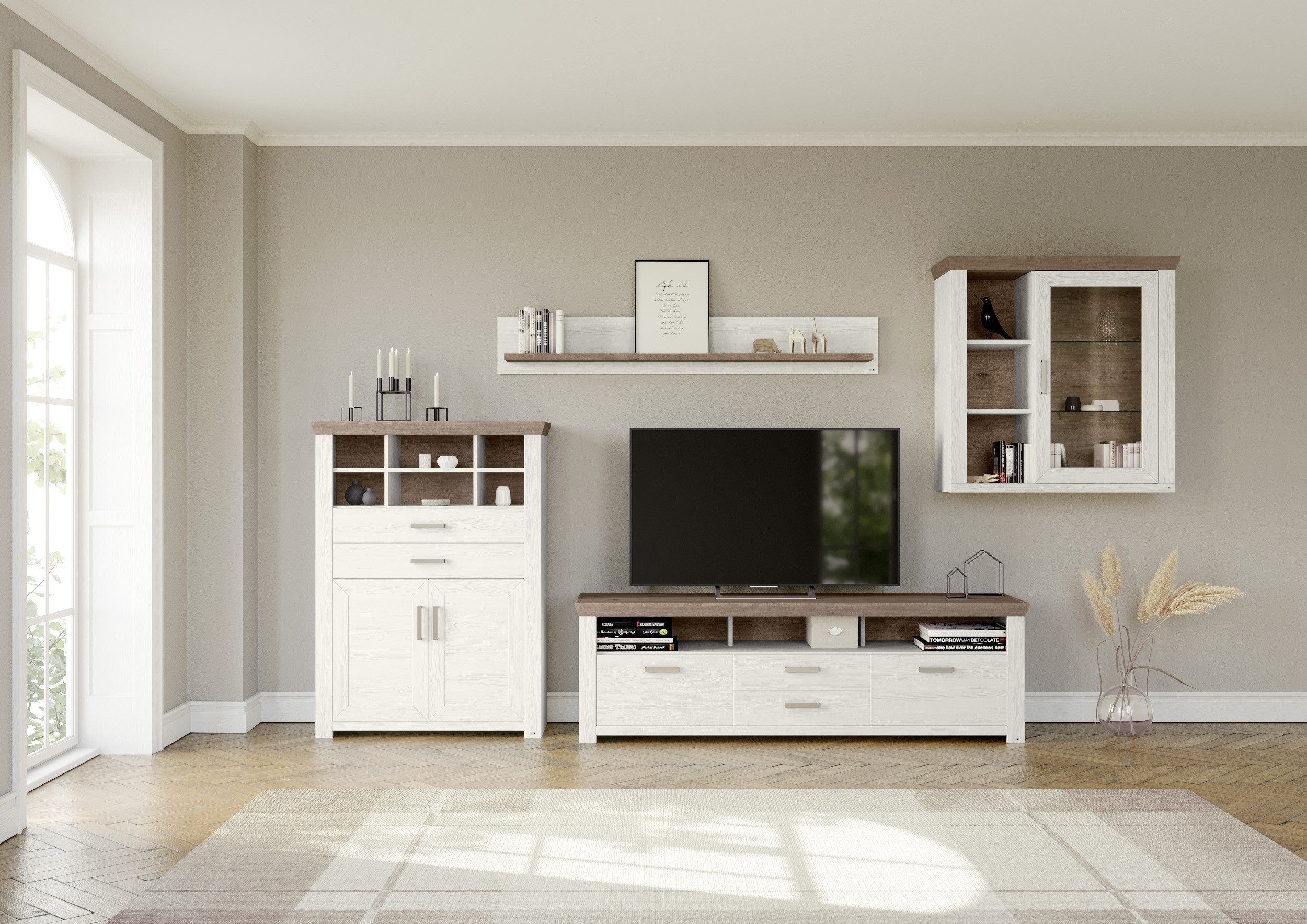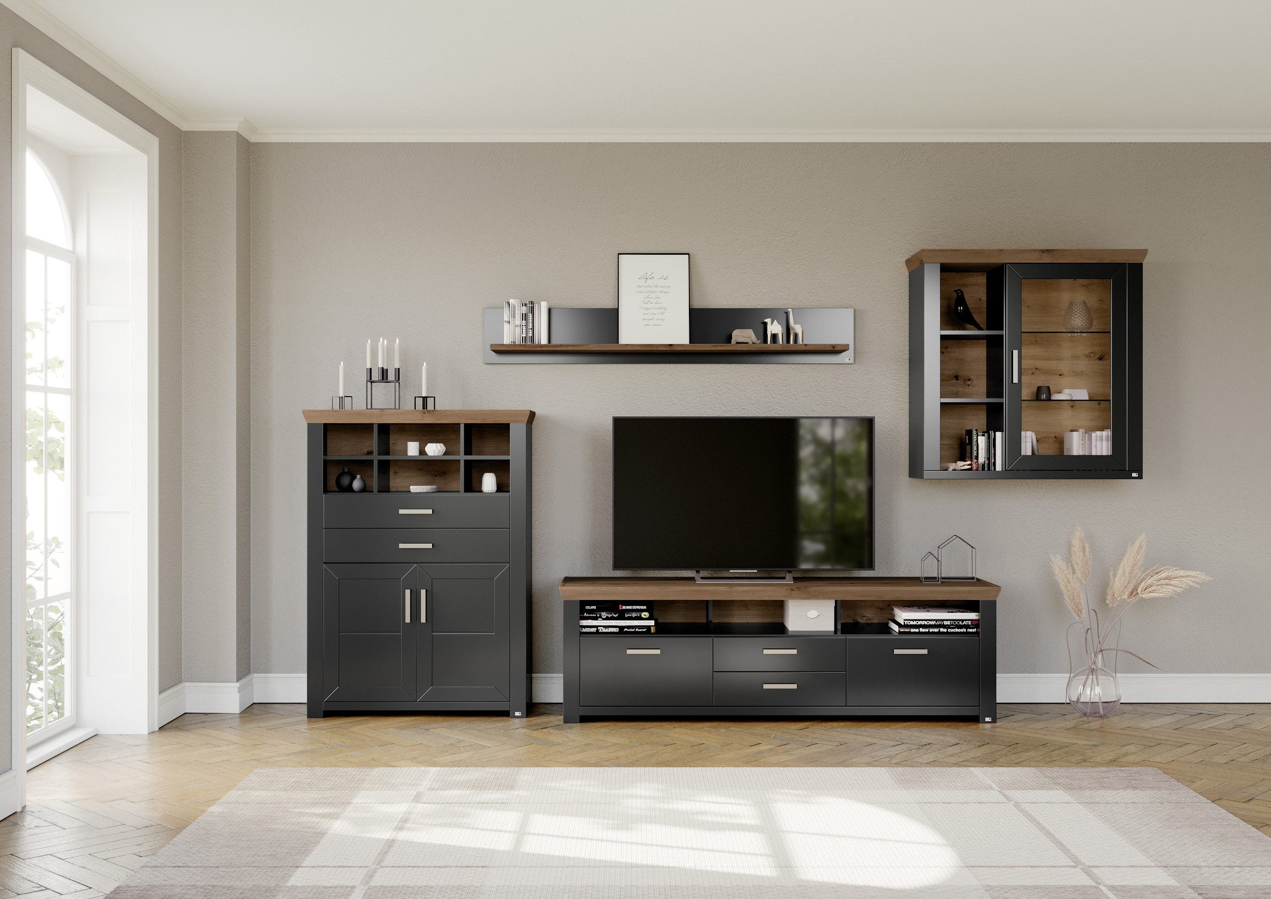 Hinweis Lieferumfang | Das Set beinhaltet je 1 Highboard, Hängeschrank, Lowboard und Wandpaneel, Beleuchtung muss dazu bestellt werden |