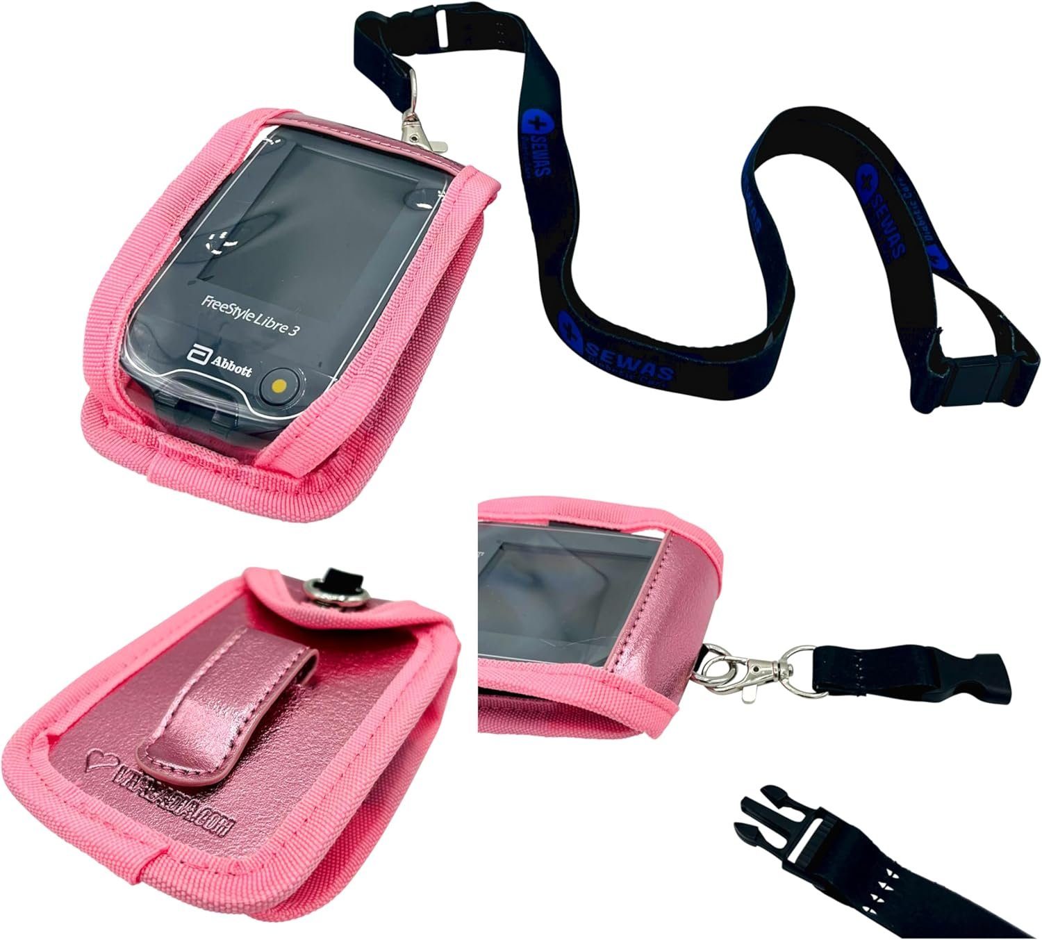 Tasche mit Halsband zum Umhängen, Gürtelclip und Sichtfenster passend für das Freestyle Libre 1, 2 & 3 Messgerät. 100% passgenau und speziell angefertigt für das Freestyle Libre Messgerät 1, 2 & 3 - Auch passend für viele weitere Blutzucker Messgeräte. Stabile sichere Tasche mit Druckknopf-Verschluss zum Umhängen. Inkl. Umhängeband. Hier in einem sehr schönem Rosa.