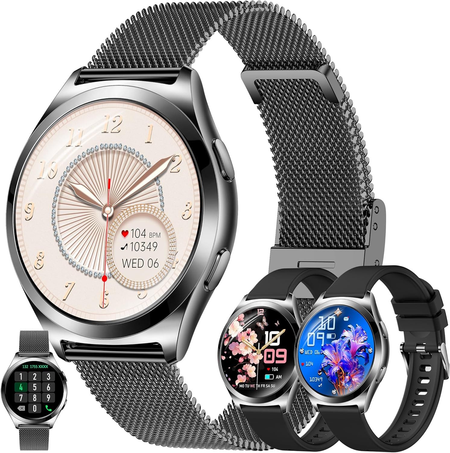 Die Smartwatch besitzt ein 1.27 Zoll HD-Farbdisplay mit Full-Touch-Bedienung. Gestalten Sie den Bildschirm individuell mit eigenen Fotos. Im Lieferumfang enthalten sind ein Armband aus Edelstahl und zwei Silikonarmbänder für unterschiedliche Anlässe.