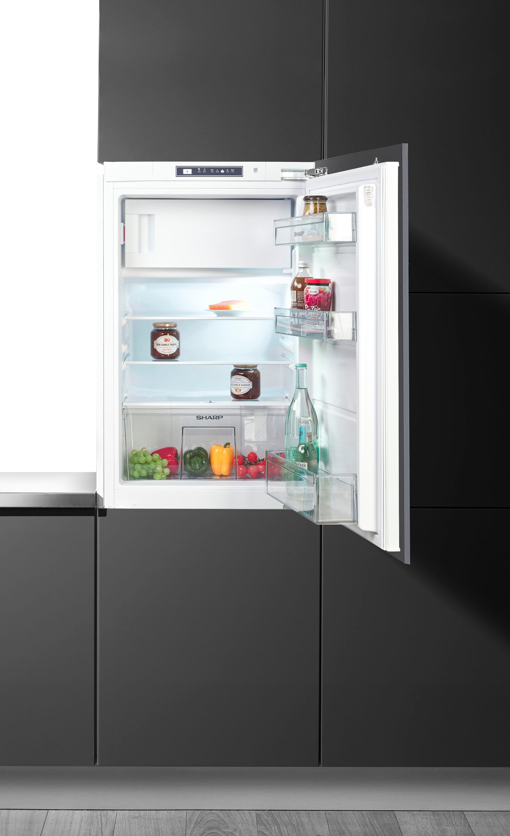 Der Einbaukühlschrank »SJ-LD110E0XD-EU« von Sharp hat eine hohe Funktionalität und ist integrierbar. Bei einem Gefriervolumen von 16 l und Kühlvolumen von 96 l betragen die Maße des Modells 54 x 87,5 x 54,5 cm (B/H/T). Damit eignet es sich insbesondere für eine Person oder als Zweitgerät. Das Modell arbeitet mit einem Betriebsgeräusch von 33 dB. Das Modell besitzt eine Gemüseschublade. Auf drei Ablageflächen ist im Einbaukühlschrank genug Raum für Lebensmittel. Schnell griffbereit sind Lebensmittel in den drei Türablagen. Die Schnellgefrier-Funktion sorgt dafür, dass sich die Lebensmittel besonders schnell kühlen und einfrieren lassen. Dank der LED-Innenbeleuchtung findet man außerdem immer schnell, wonach man sucht. Der »SJ-LD110E0XD-EU« von Sharp ist ein Einbaukühlschrank, der mit seinen Features überzeugt und ausreichend Platz für Nahrungsmittel aller Art bietet.