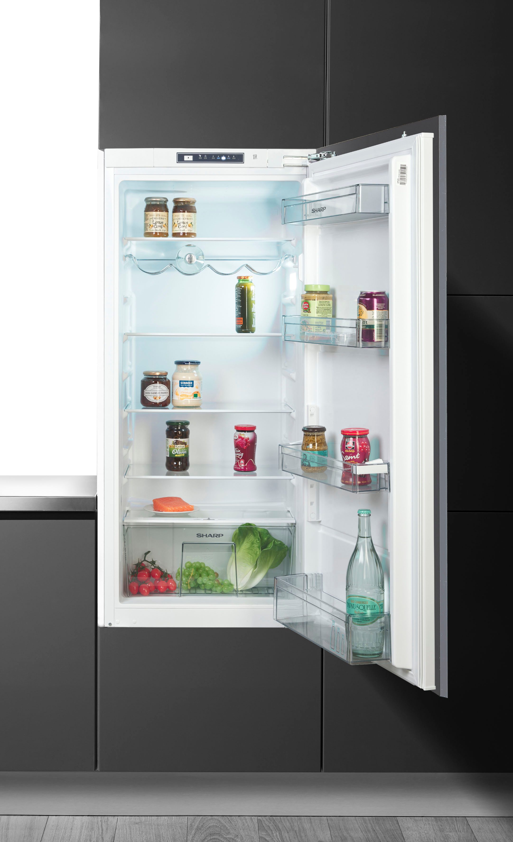 Der Einbaukühlschrank »SJ-LD195E0XD-EU« ist von der Marke Sharp und integrierbar. Bei einem Kühlvolumen von 193 l betragen die Maße des Modells 54 x 122,5 x 54,5 cm (B/H/T). Das Modell arbeitet mit einem Betriebsgeräusch von 32 dB. Es ist eine Gemüseschublade zum Verstauen des Einkaufs integriert. Auf sechs Ablageflächen ist im Einbaukühlschrank viel Platz für Lebensmittel. Zusätzliche Flexibilität bei der Lagerung bieten die vier Türablagen. Всеs im Blick hat man außerdem durch die LED-Innenbeleuchtung. Wer auf der Suche ist nach einem Modell, das ausreichend Raum für Nahrungsmittel bietet, der trifft mit dem »SJ-LD195E0XD-EU« von Sharp eine gute Wahl.