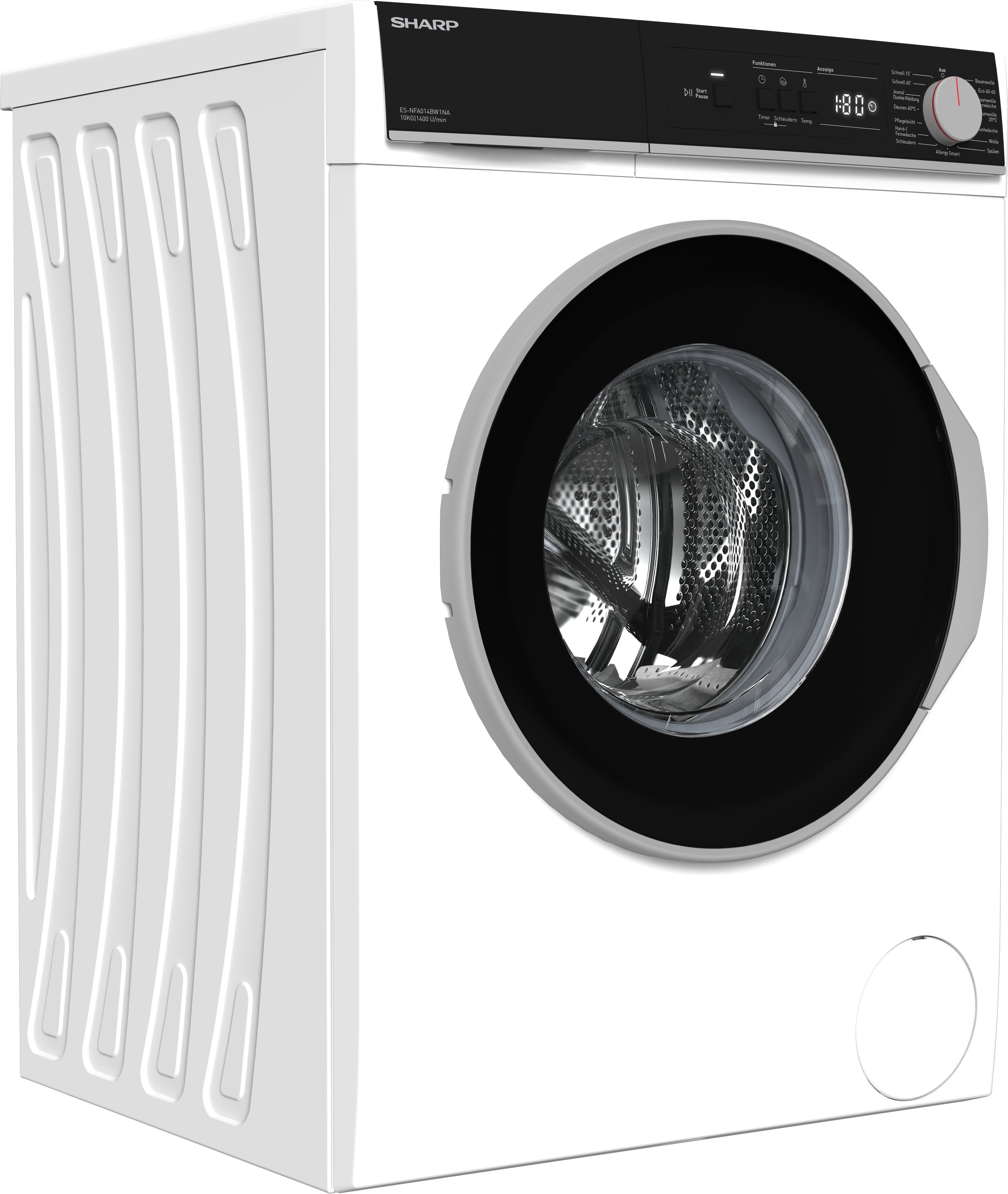 Die ES-NFA014BW1NA-DE ist eine Waschmaschine von Sharp. Die Energieeffizienzklasse A (Skala: A bis G) zeichnet diese Waschmaschine als besonders stromsparendes Modell aus. Der Frontlader eignet sich vor allem für Haushalte ab 5 Personen, da dieser 10 kg Fassungsvermögen hat. Außerdem bietet die ES-NFA014BW1NA-DE Waschmaschine unter anderem diese Top-Features: AquaStop und Schaumsensor. Keine Waschmittelrückstände bleiben in den Textilien, selbst wenn einmal zu viel Waschmittel in die Trommel gegeben wurde, denn dann reagiert die Schaumerkennung und legt einen extra Spülgang ein. Anhand der Startzeitvorwahl lässt sich individuell einstellen, wann die ES-NFA014BW1NA-DE Waschmaschine mit dem Waschgang beginnen soll. Über die Restlaufanzeige ist jederzeit ersichtlich, wie viel Zeit von der Waschmaschine noch für den laufenden Waschgang benötigt wird. Die ES-NFA014BW1NA-DE Waschmaschine ist ebenfalls mit einer Kindersicherung ausgestattet. Bei Maßen von 59,7 cm x 84,5 cm x 58,2 cm (BxHxT) vereint die Waschmaschine Form und Funktion auf attraktive Weise.