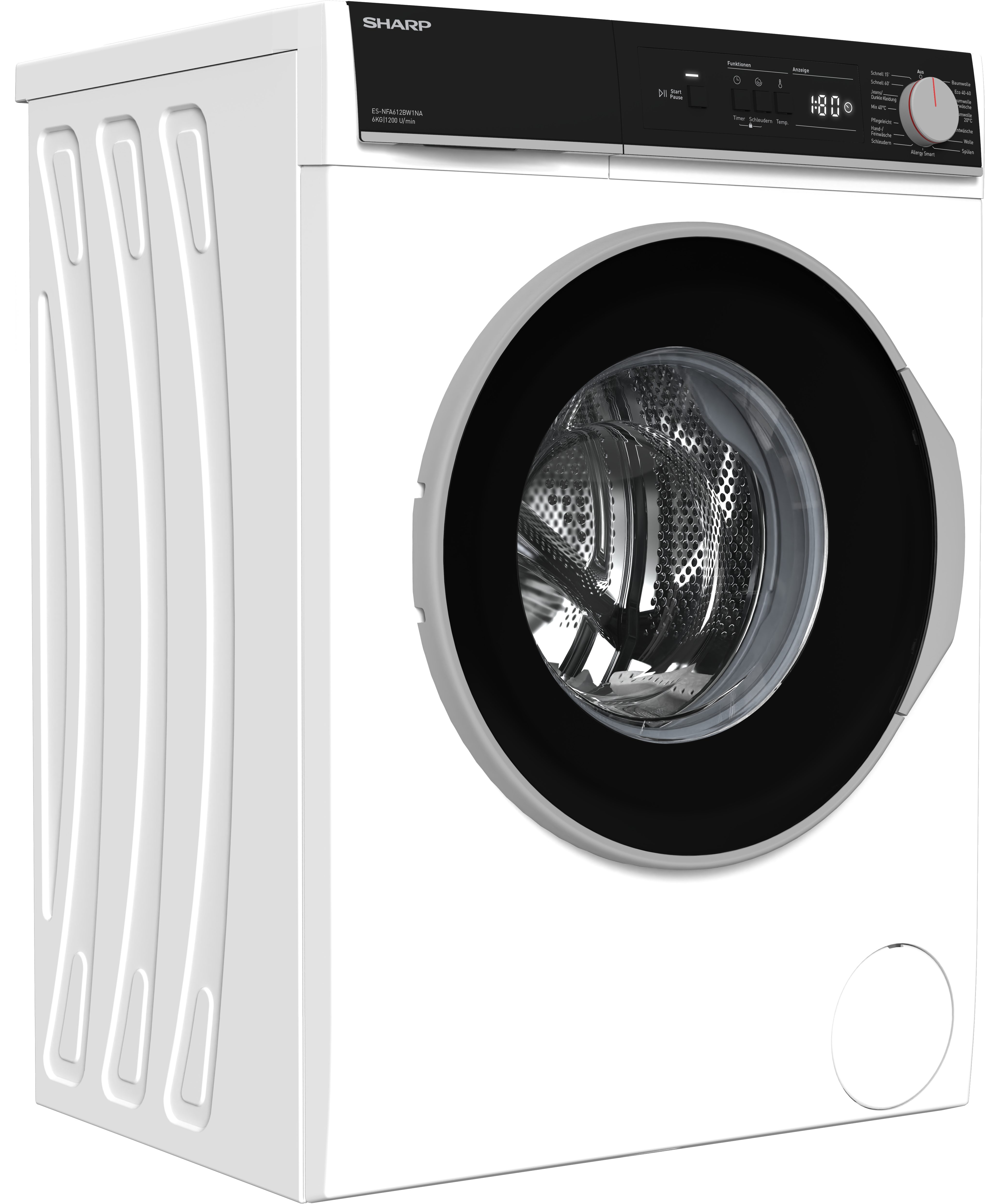 Die ES-NFA612BW1NA-DE ist eine Waschmaschine von Sharp. Ausgezeichnet mit der Energieeffizienzklasse A (Skala: A bis G) fällt der Energiebedarf dieser Waschmaschine äußerst niedrig aus. Der Frontlader eignet sich vor allem für Haushalte mit bis zu 3 Personen, da dieser 6 kg Fassungsvermögen hat. Folgende Top-Features zeichnen die ES-NFA612BW1NA-DE Waschmaschine aus: AquaStop und Schaumsensor. Keine Waschmittelrückstände bleiben in den Textilien, selbst wenn einmal zu viel Waschmittel in die Trommel gegeben wurde, denn dann reagiert die Schaumerkennung und legt einen extra Spülgang ein. Anhand der Startzeitvorwahl lässt sich individuell einstellen, wann die ES-NFA612BW1NA-DE Waschmaschine mit dem Waschgang anfangen soll. Die übrige Programmdauer wird auf der Restlaufanzeige dargestellt. So sieht man immer, wie lange die Waschmaschine noch für den Waschgang braucht. Die ES-NFA612BW1NA-DE Waschmaschine ist ebenfalls mit einer Kindersicherung ausgestattet. Bei Maßen von 59,7 cm x 84,5 cm x 49,7 cm (BxHxT) vereint die Waschmaschine Form und Funktion auf attraktive Weise.