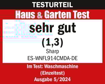 Die Sharp ES-WNFL914CMDA-DE erzielt im Einzeltest des Magazins „Haus & Garten Test“ das Gesamtergebnis „sehr gut (1,3)“. Das Gerät funktioniert hervorragend: Die Waschwirkung, die Schleudereffizienz und die Spülwirkung sind jeweils „sehr gut“. Es ist sehr einfach zu bedienen sowie zu reinigen und „gut“ zu be- und entladen. Außerdem verbraucht es wenig Strom, hat einen sehr geringen Wasserverbrauch und ist hochwertig verarbeitet. Insgesamt liefert das Modell „energiesparenden Waschkomfort“.
