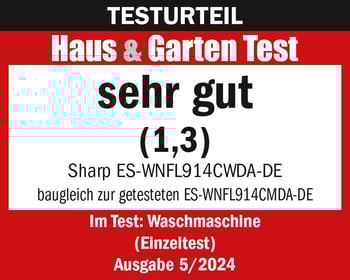 Die Sharp ES-WNFL914CWDA-DE („baugleich zur getesteten ES-WNFL914CMDA-DE“) erzielt im Einzeltest des Magazins „Haus & Garten Test“ das Gesamtergebnis „sehr gut (1,3)“. Das Gerät funktioniert hervorragend: Die Waschwirkung, die Schleudereffizienz und die Spülwirkung sind jeweils „sehr gut“. Es ist sehr einfach zu bedienen sowie zu reinigen und „gut“ zu be- und entladen. Außerdem verbraucht es wenig Strom, hat einen sehr geringen Wasserverbrauch und ist hochwertig verarbeitet. Insgesamt liefert das Modell „energiesparenden Waschkomfort“.