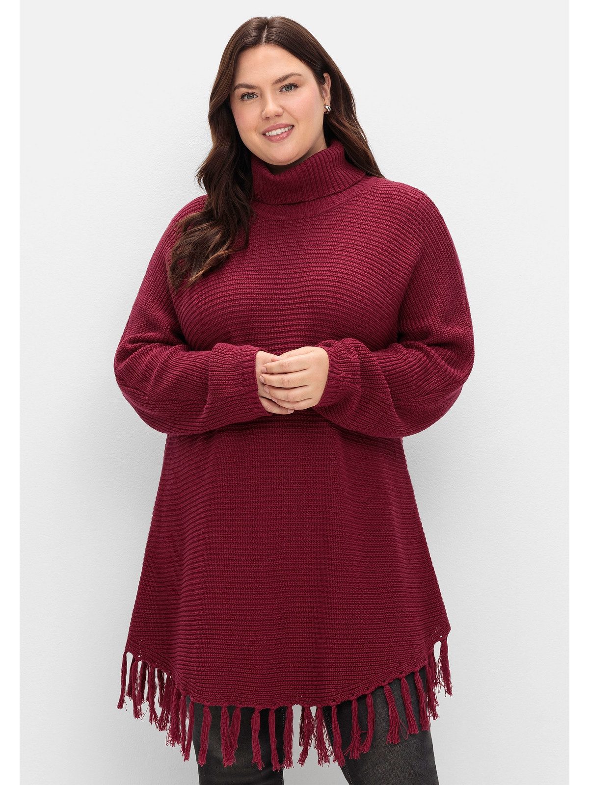 Besondere Merkmale | in weiter Ponchoform mit Fransensaum |