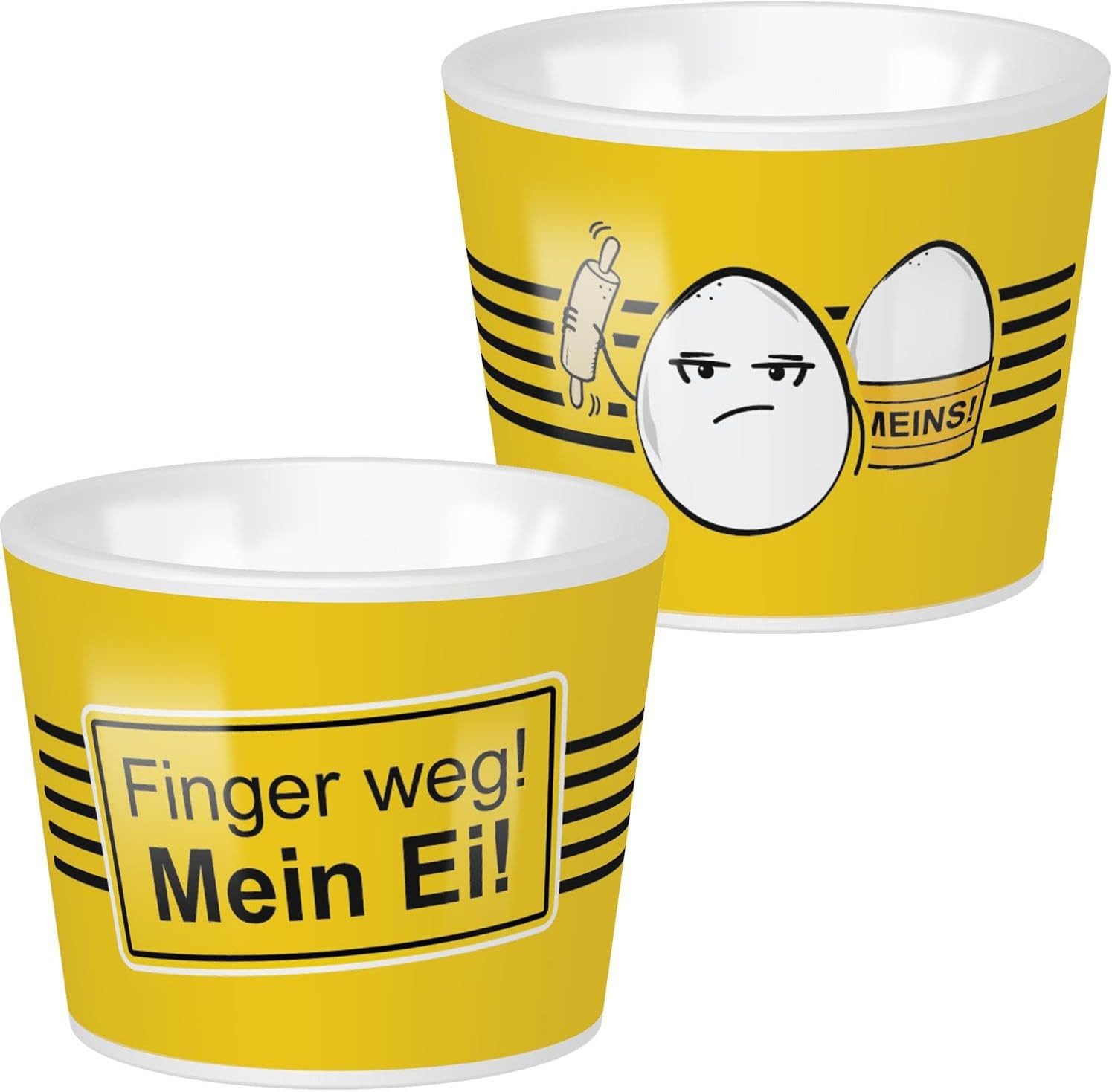 LUSTIGER EIERBECHER: Eierbecher mit farbigem Motivdruck "Finger weg! Mein Ei!", Eierbecher aus Porzellan mit buntem Dekor, Höhe 4,3 cm, Durchmesser 5,2 cm, als kleines Geschenk perfekt geeignet.