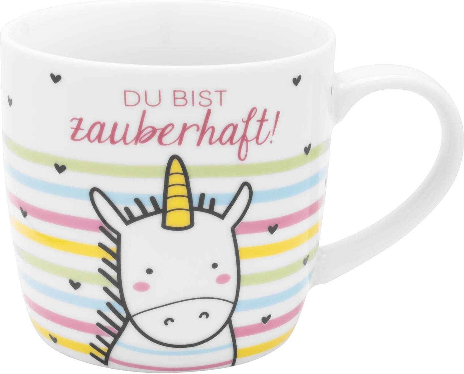KINDERTASSE MIT SPRUCH: Becher mit farbigem Motivdruck "Einhorn" und mit lustigem Spruch "Du bist zauberhaft", Material Porzellan, Volumen 30 cl, Lieblingsbecher für KiTa-Kids und Schulkinder, verpackt in passend gestalteter Geschenkbox.