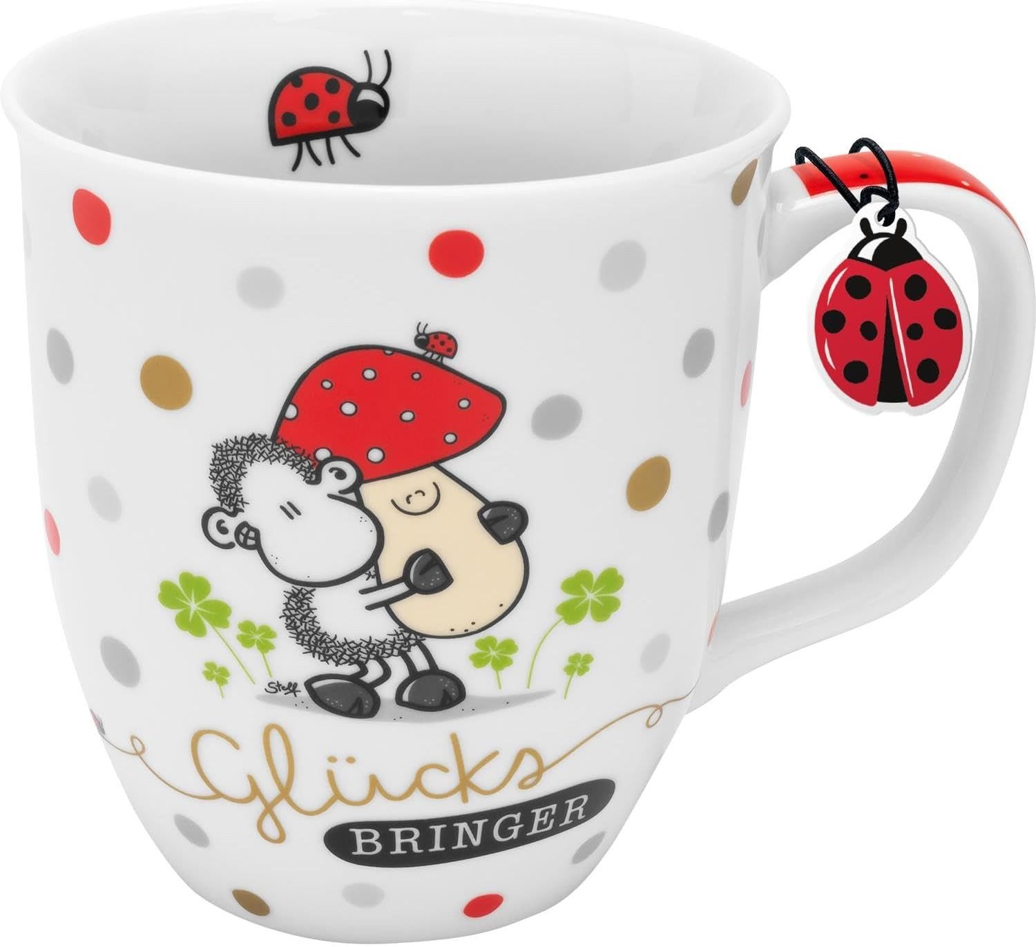SHEEPWORLD TASSE MIT SPRUCH: Tasse aus Porzellan mit farbigem Sheepworld-Motiv und passendem Spruch "Glücksbringer", Volumen 40 cl, Höhe 10,5 cm, spülmaschinengeeignet.