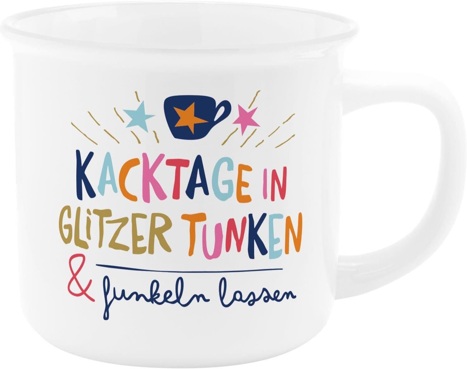 TASSE MIT SPRUCH: Kaffeebecher mit farbigem Regenbogen-Dekor mit Sternen, Tasse mit Spruch „…tage in Glitzer tunken und funkeln lassen“, Volumen ca. 35 cl, Becher mit Golddruck, verpackt in dekorativer Geschenkbanderole aus Pappe.