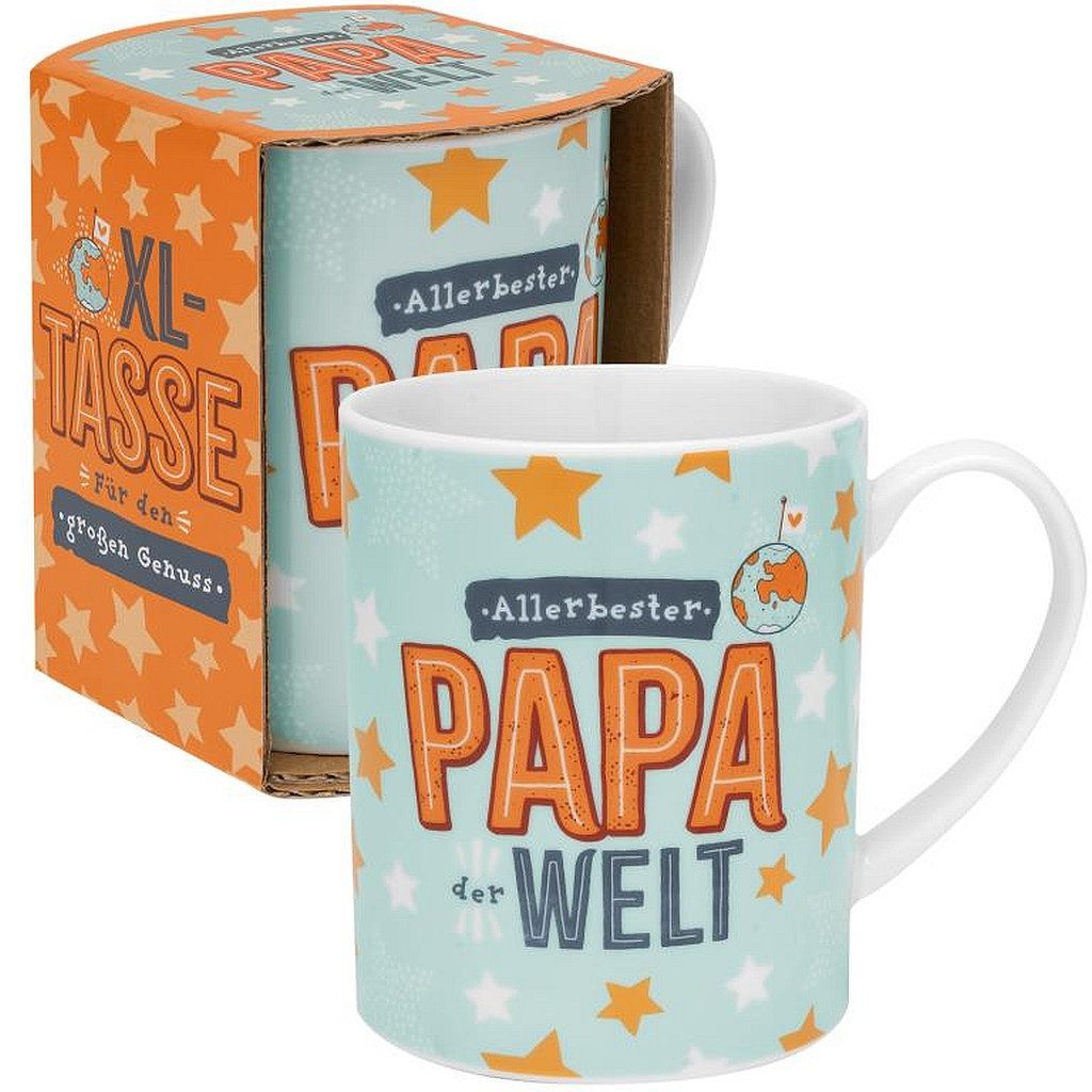 XL-TASSE MIT SPRUCH: Große Kaffetasse oder Teetasse aus Porzellan mit farbigem Motivdekor und Spruch „Всеrbester Papa der Welt“, Volumen 60 cl (geeignet für eine Füllmenge von rund 50 cl), Durchmesser 9,5 cm, Höhe 11,5 cm, verpackt in eine passend gestaltete Geschenk-Banderole.
