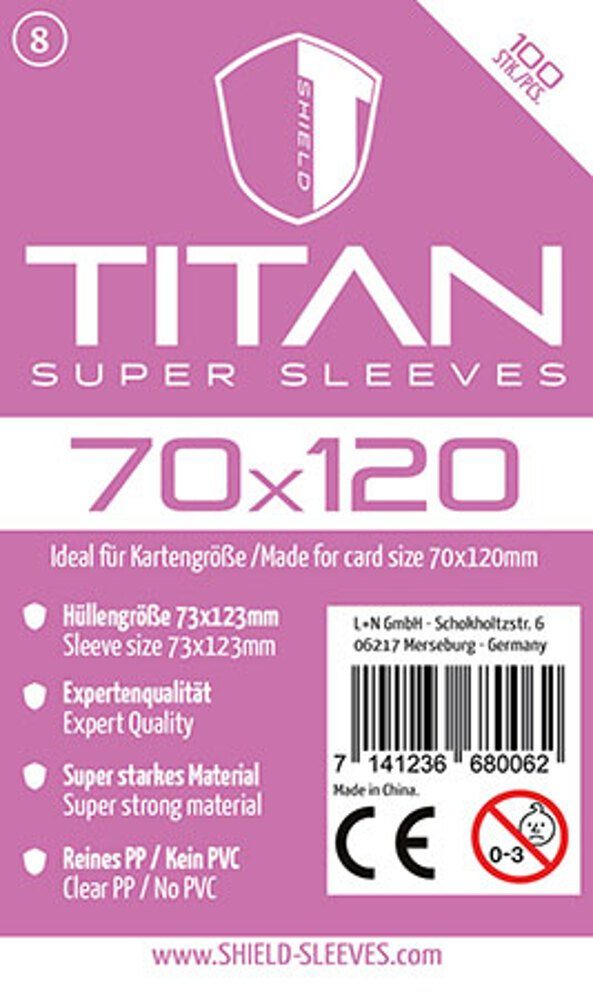 Hüllengröße: 73 x 123 mm für Kartengröße: 70 x 120 mm Diese Shield Schutzhüllen in Expertenqualität sind speziell für Spielkarten aus Brett- und Kartenspielen entworfen worden. In jeder Packung befinden sich 100 Kartenhüllen in den Maßen 73 x 123 mm (für Karten in den Maßen 70 x 120 mm) zum Schutz und zur Aufbewahrung der Spielkarten. Säurefrei, PVC-frei(reines PP), super starkes Material, durchsichtig. Dicke: 110µm