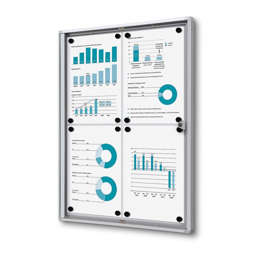 Präsentieren Sie Ihre Speisekarte und Preise auf dem abschließbaren Innenschaukasten Economy. Dieser hochwertige Schaukasten verfügt über eine Stahlrückwand, die mit Markierstiften und Magneten verwendet werden kann. Die abschließbare Flügeltür wird mit 2 Schlüsseln geliefert. Der Schaukasten ist in verschiedenen Größen erhältlich, kann an der Wand montiert werden und bietet eine Feuerschutzoption. Mit auf Gehrung geschnittenen Ecken und für den Innenbereich geeignet, eignet er sich ideal für Schulen, Büros, Restaurants oder öffentliche Räume.