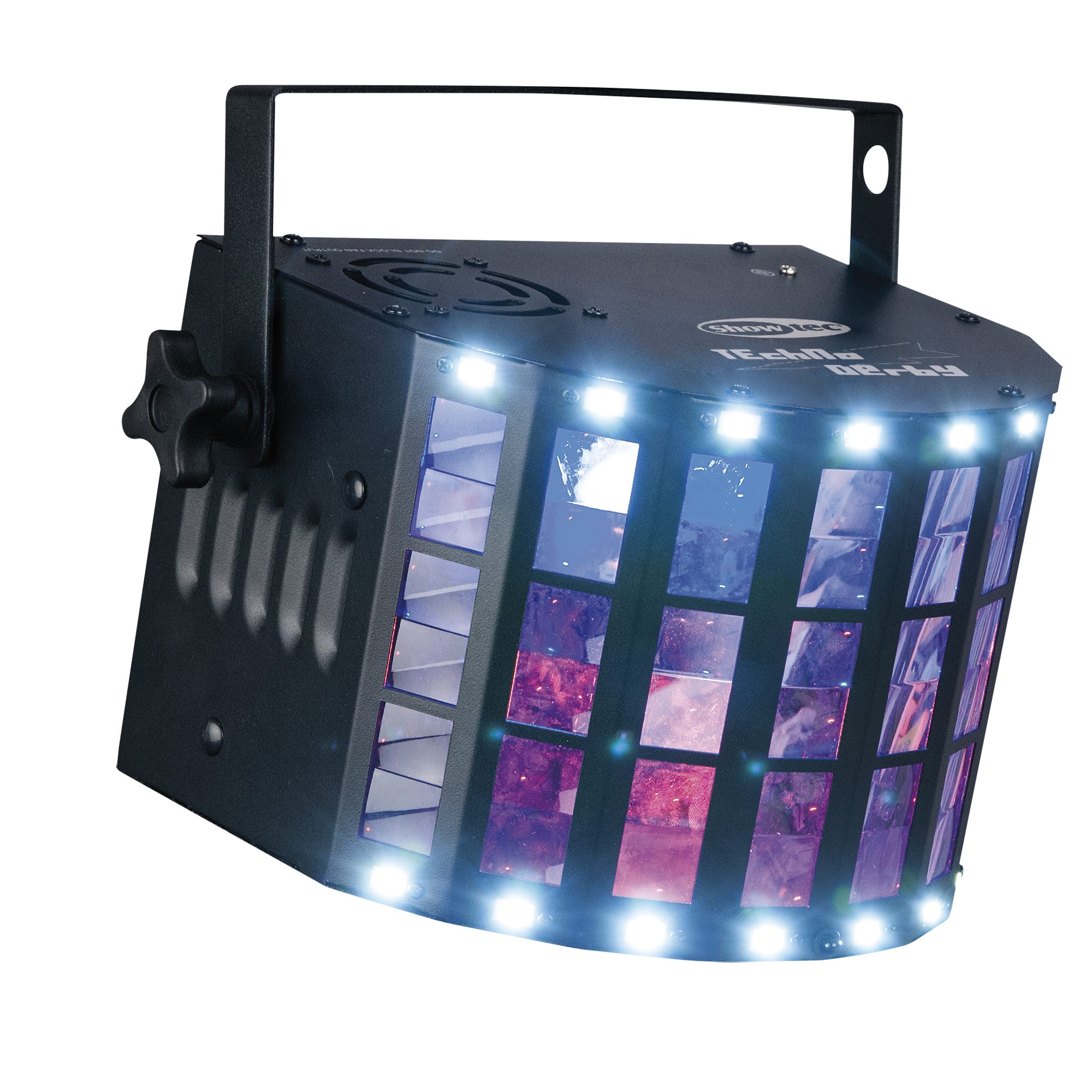 Der Showtec Techno Derby ist ein 2-in-1-Effektstrahler mit 16 leistungsstarken weißen Blitz-LEDs und einem RGBW-LED-Lichteffekt mit einer Leistung von 4x3 Watt. Beide Effekte können separat im automatischen oder musikgetakteten Modus abgespielt werden. Er kann auch über DMX angesteuert und somit vollständig kontrolliert werden. Das Stroboskop besteht aus 16 Sektionen mit unterschiedlichen vorprogrammierten Mustern. Все RGBW-Farben können einzeln oder in zahlreichen vorprogrammierten Kombinationen angesteuert werden. Mit mehreren Techno Derbys können Sie im Master/Slave-Modus eine synchronisierte Lichtshow erstellen. Wenn Sie nach einer Lösung suchen, die eine Stroboskopfunktion und farbige LED-Lichteffekte in sich vereint und auch noch vollständig ansteuerbar ist, ist der Showtec Techno Derby genau das, wonach Sie suchen. Eine Fernbedienung ist enthalten.