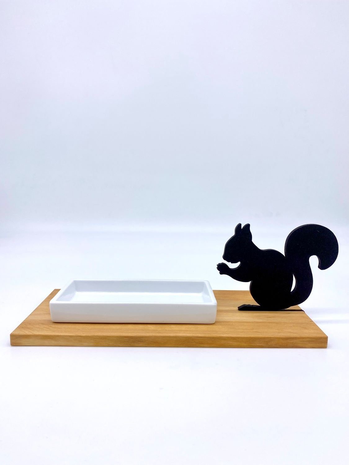 Lass das Eichhörnchen in dir jubeln, denn diese Schale wird seine Freude wecken. Mit einer weißen Porzellanschale, einem braunen Holzbrett als Unterlage und einer integrierten Eichhörnchen-Silhouette ist dieses Design ein Blickfang auf jedem Tisch.