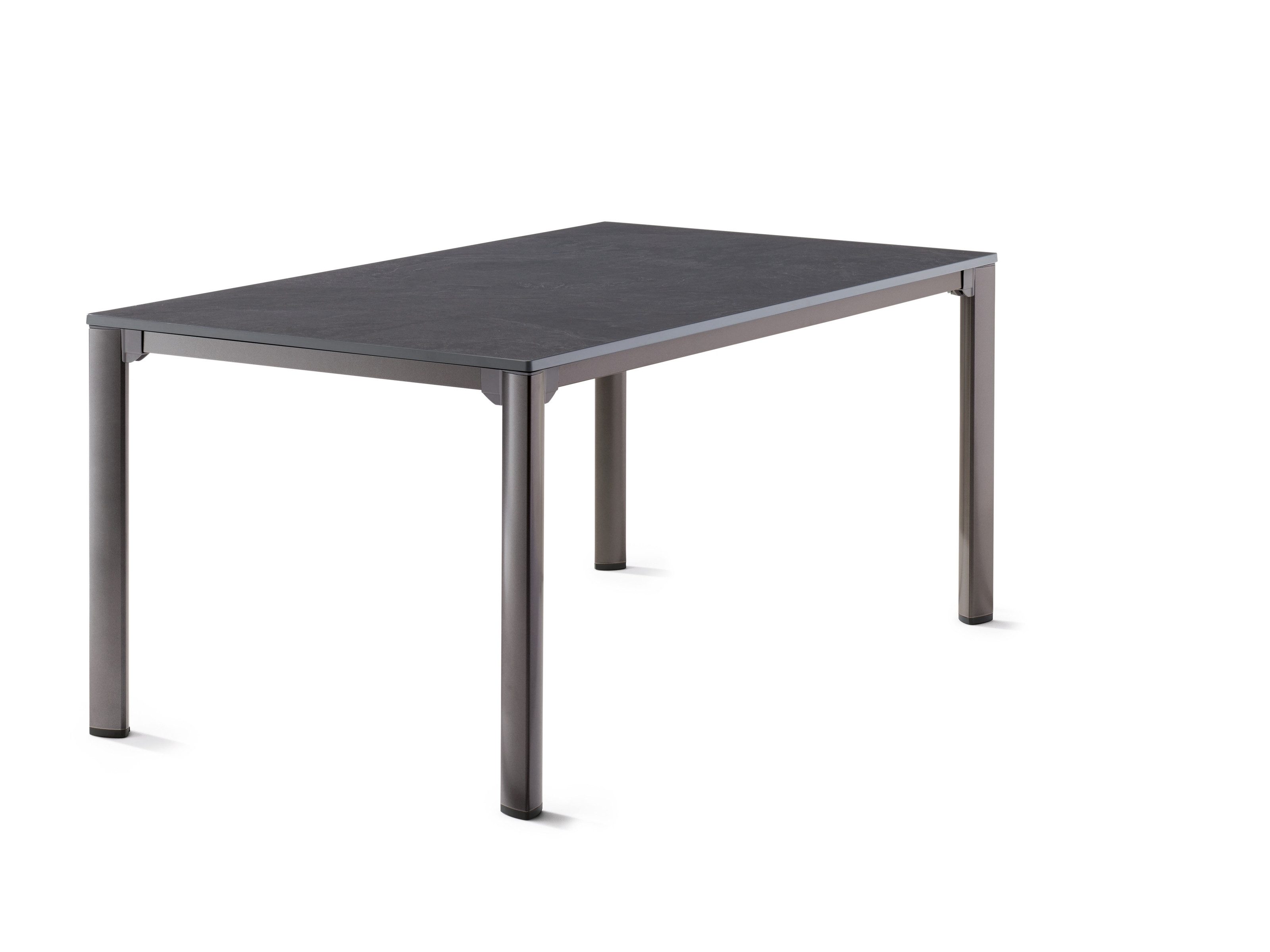 Der Loft Vivodur Gartentisch ist die perfekte Mischung aus Funktionalität und Ästhetik, konzipiert für den anspruchsvollen Objektbereich. Mit den Abmessungen von 165 cm Breite, 95 cm Tiefe und 74 cm Höhe bietet dieser Tisch eine großzügige Fläche, die sich ideal für verschiedenste Anwendungen im Garten oder auf der Terrasse eignet. Die Tischplatte aus dem innovativen Material vivodur® ist in einem eleganten Schiefer anthrazit gehalten. Dieses Material zeichnet sich durch seine außerordentliche Robustheit und Langlebigkeit aus, was den Tisch besonders widerstandsfähig gegen Witterungseinflüsse macht. Das schlichte und gleichzeitig moderne Design fügt sich nahtlos in jede Umgebung ein und sorgt für ein stilvolles Ambiente. Ein herausragendes Merkmal des Loft Vivodur Gartentisches ist seine exzellente Witterungsbeständigkeit. Die vivodur®-Tischplatte ist nicht nur extrem widerstandsfähig gegen mechanische Beanspruchungen, sondern auch UV-beständig. Diese Eigenschaften gewährleisten, dass die Tischplatte ihre Farbe und Form auch bei intensiver Sonneneinstrahlung und extremen Wetterbedingungen behält. Das schiefer anthrazitfarbene Finish der Tischplatte harmoniert perfekt mit dem eisengrauen Gestell, wodurch ein eleganter Kontrast entsteht, der jede Outdoor-Einrichtung aufwertet. Die hochwertige Verarbeitung und die Verwendung langlebiger Materialien machen diesen Tisch zu einer nachhaltigen Wahl für den Außenbereich. Das Gestell des Loft Vivodur Gartentisches besteht aus leichtem, aber stabilem Aluminium und ist in der modernen Farbe Eisengrau gehalten. Diese Materialwahl sorgt nicht nur für eine ansprechende Optik, sondern auch für eine hohe Stabilität und Langlebigkeit. Ein besonderes Feature ist die Höhenverstellung an einem der Tischfüße, die eine optimale Anpassung an verschiedene Untergründe ermöglicht. Mit einem Gewicht von 28,1 kg bietet der Tisch eine solide Standfestigkeit, bleibt aber gleichzeitig mobil genug, um bei Bedarf leicht umgestellt werden zu
