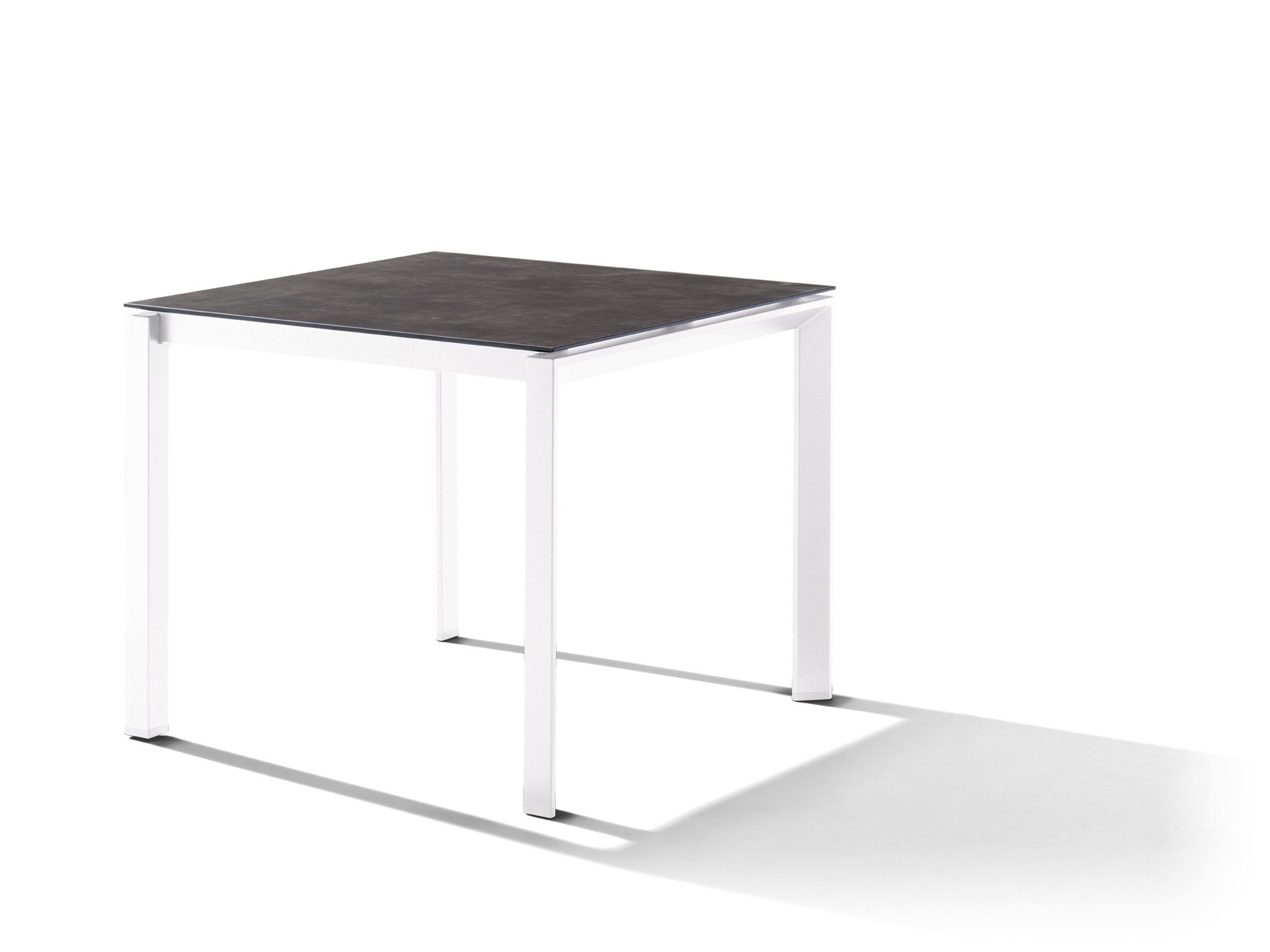 Die Freesystem Tischplatte hat die Maße 90 cm (B) x 90 cm (T) x 1,2 cm (H) und ist ideal für den Objektbereich geeignet, mit robustem Polytec®-Material und moderner Beton dunkler O