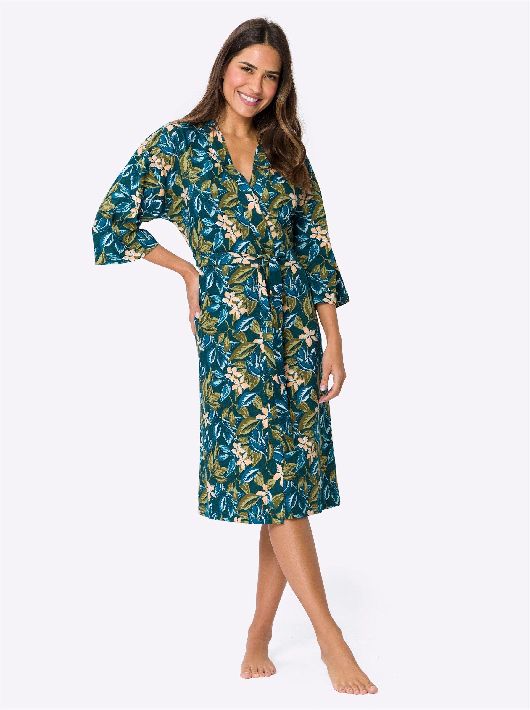 Der üppige Blüten-und Blätterdruck macht den Morgenmantel in trageangenehmer Single-Jersey-Qualität zum wunderschönen Hingucker. In modischer Kimono-Form mit V-Ausschnitt, überschnittenen Schultern, 3/4-Ärmeln, Gürtelschlaufen und bedrucktem Bindegürtel.