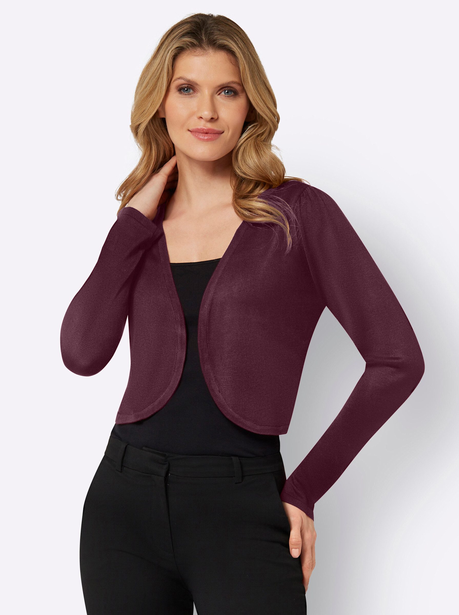 Unglaublich weicher, kurzer Strickbolero in modisch offener Form. Mit abgerundetem Saum vorne. Sorgfältig der Passform gerecht in Form gestrickt.