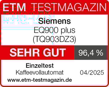 Der Siemens EQ900 plus (TQ903DZ3) erzielt im Einzeltest des „ETM TESTMAGAZINS“ das Gesamtergebnis „sehr gut (96,4 %)“. Sowohl der Brühvorgang als auch die Qualität der Crema und des Milchschaums sind „sehr gut“. Das Gerät ist sehr einfach zu bedienen sowie zu reinigen und ist sehr schnell einsatzbereit. Es verbraucht sehr wenig Strom und die Schallemissionen sind sehr gering. Im Bereich der Individualisierung glänzt das Gerät im puncto Volumen, Aroma, Temperatur und Mahlgrad. Außerdem ist es hervorragend verarbeitet. Insgesamt ist das Modell „der komfortabelste Kaffeevollautomat“.
