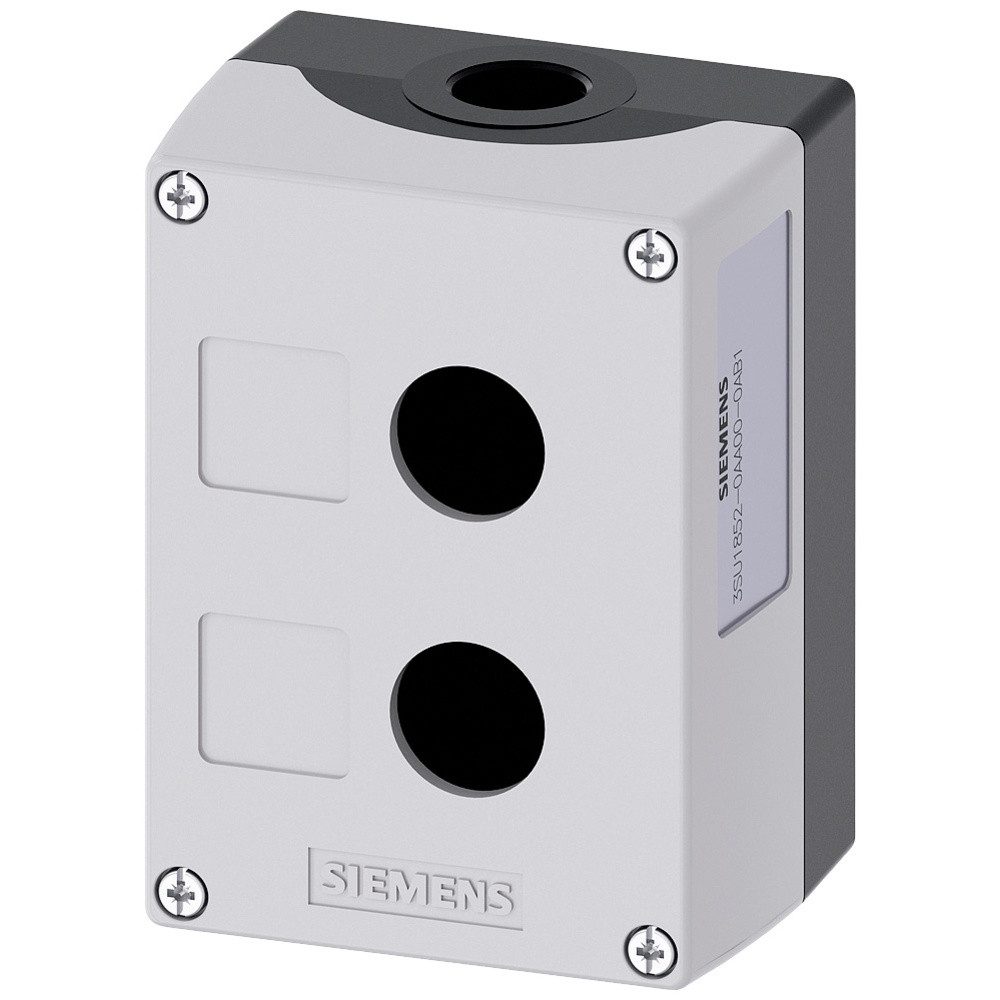 Gehäuse für Befehlsgeräte, 22 mm, rund, Gehäusematerial Metall, Gehäuseoberteil grau, 2 Befehlsstellen, ohne Bestückung, Vertiefung für Schilder, Bodenbefestigung, oben und unten je 1xM20 Gehäuse SIRIUS ACT für die Montage der 22,5 mm Befehls- und Meldegeräte bei räumlich getrennter Anordnung von Steuereinheiten und Schaltschränken.